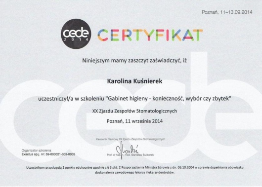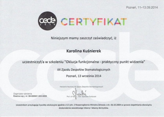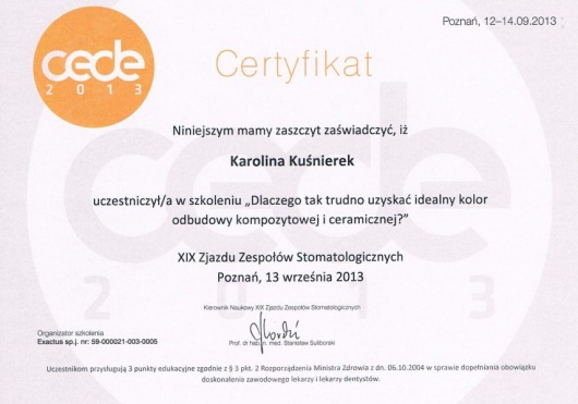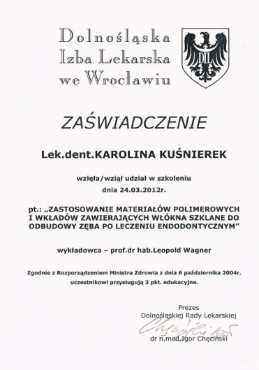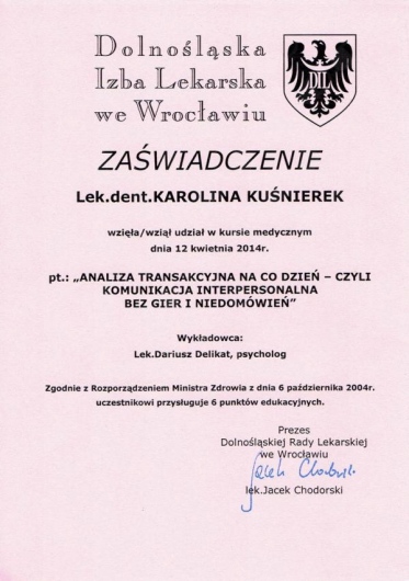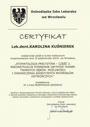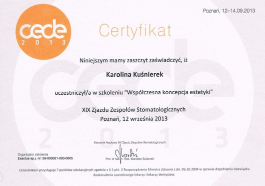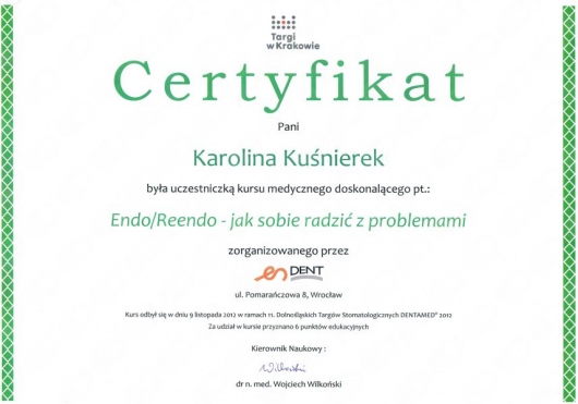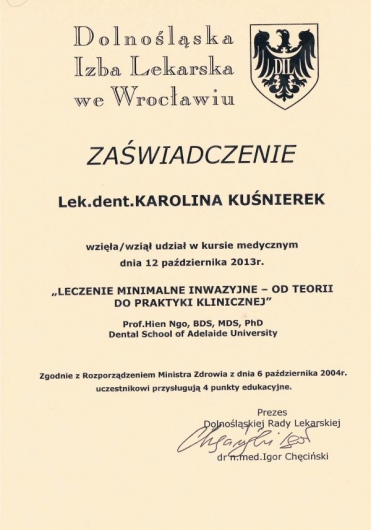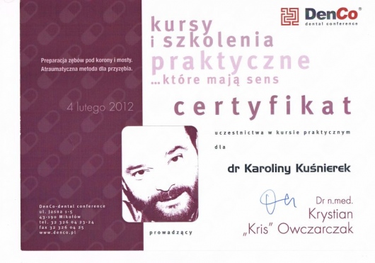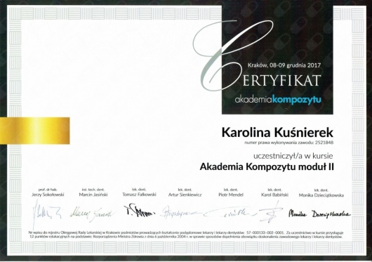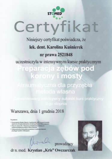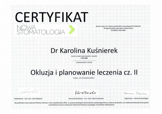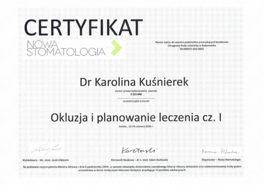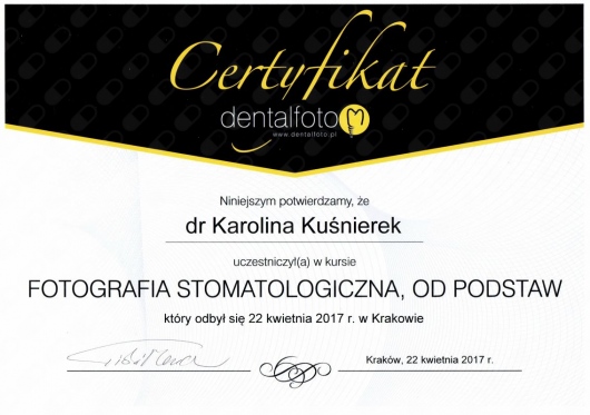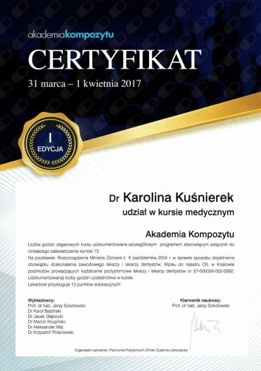 Pani doktor Karolina Kusnierek jest w moich oczach lekarzem stomatologiem z powolania. Bardzo dokladne ogledziny uzebienia poprzedzajace jakiekolwiek prace, dokumentacja fotograficzna, wykonanie zdjec rentgenowskich - wszystko to mialo na celu upewnienie sie, co do kwalifikacji ktoregos z zebow do ewentualnego leczenia, a takze pozwolenia pacjentowi na zobaczenie na wlasne oczy, co niepokoi p. doktor. Bardzo spodobalo mi sie podejscie pani Karoliny do korekcji protetycznych, ktore byly glownym powodem mojej ostatniej wizyty w gabinecie. Pani doktor slucha najpierw pacjenta, pyta jaki efekt estetyczny, bylby dla niego satysfakcjonujacy, a potem dokladnie i rzetelnie informuje, jak wyglada to od strony medycznej i funkcjonalnej - ksztalt i wielkosc zebow pieczolowicie dobiera do zgryzu pacjenta. Zawsze wybiera rozwiazania najmniej inwazyjne i tym samym sa one najczesciej dla pacjenta milym zaskoczeniem, jesli chodzi o koszta. O koszcie leczenia pani doktor zawsze informuje na pierwszej wizycie i sa to maksymalne kwoty, jakie pacjent moze poniesc - bywa, ze ulegaja one redukcji - dlatego kazdy moze zaplanowac te wydatki, bez zbednego stresu.