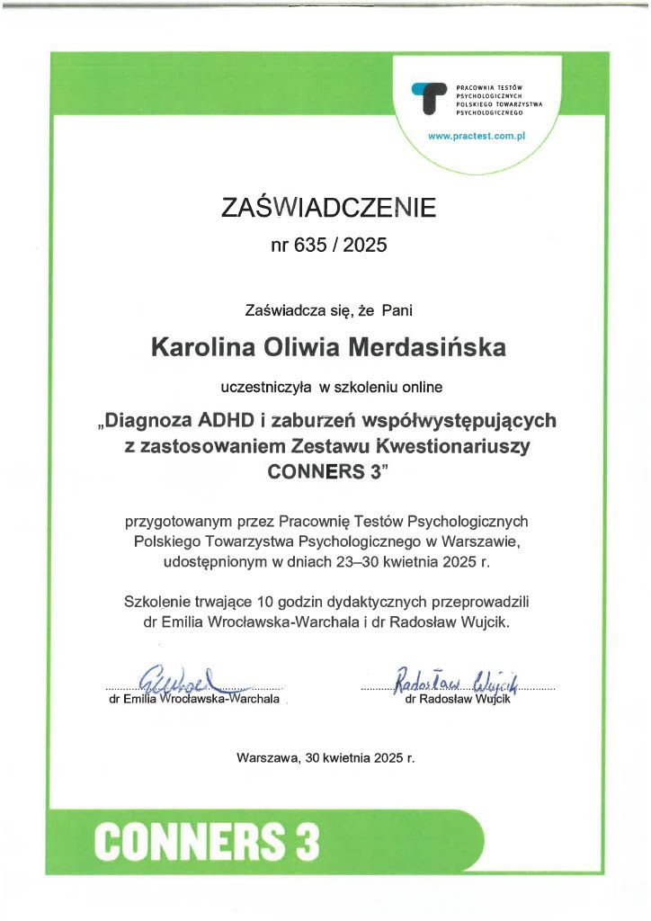 Wspieram zarówno najmłodszych, jak i ich rodziców. Prowadzę diagnozę w oparciu o narzędzie Conners-3, a w codziennej współpracy z rodzicami pomagam lepiej rozumieć funkcjonowanie dziecka i odnajdywać praktyczne rozwiązania, które wspierają rozwój oraz zwiększają poczucie bezpieczeństwa w rodzinie.