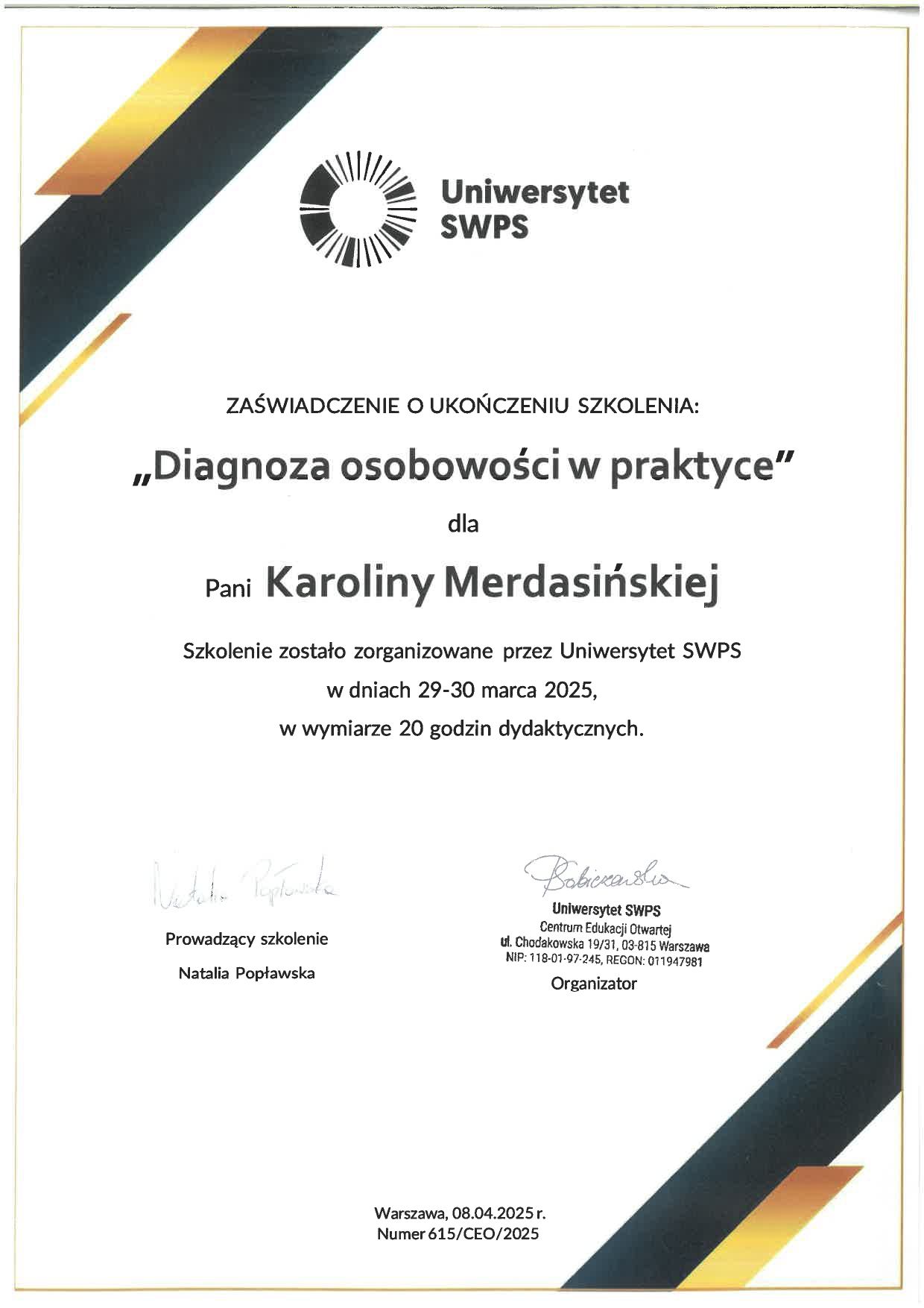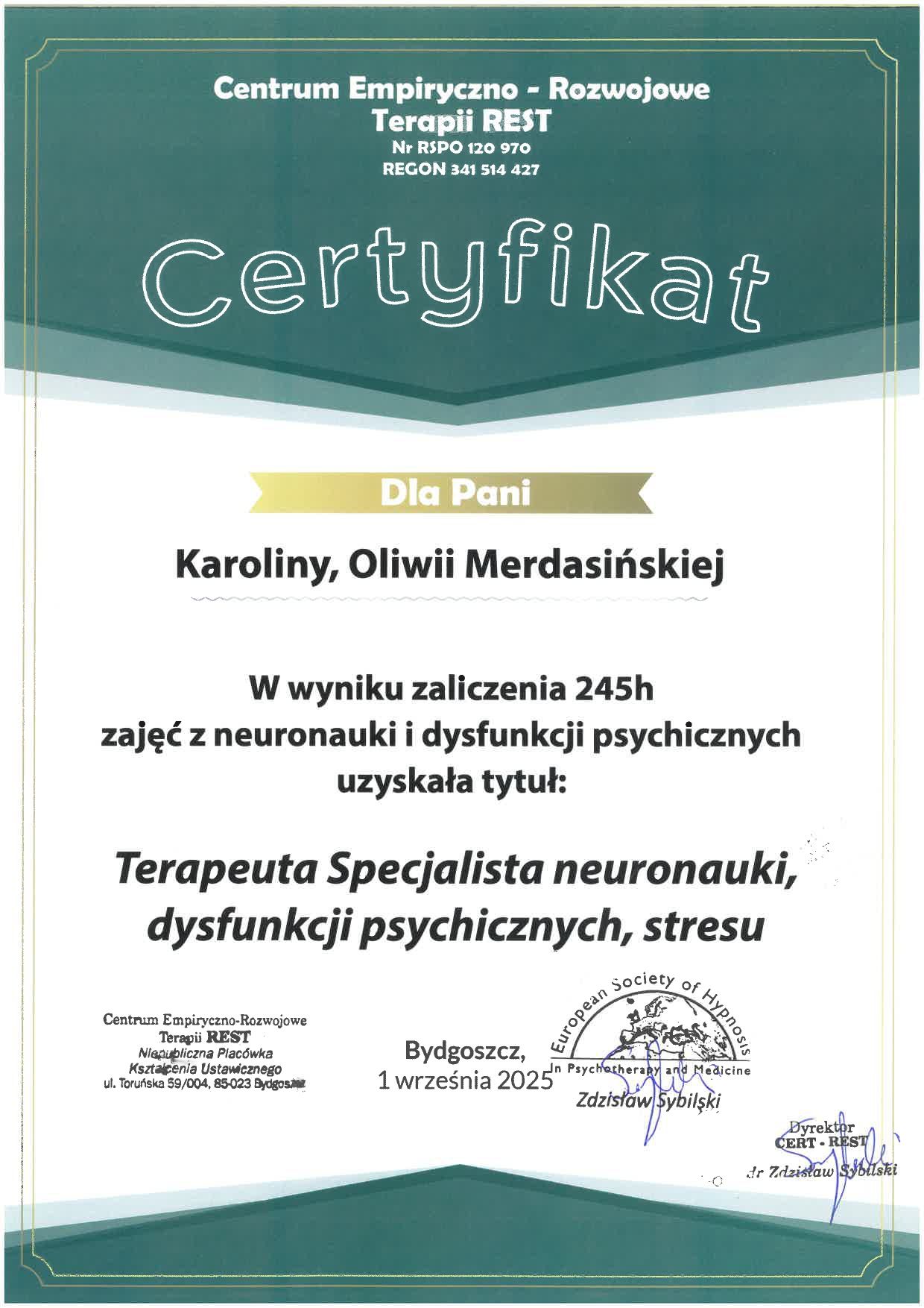 Ukończyłam psychologię w dwóch specjalnościach - psychoterapia oraz psychologia kliniczna. Aktualnie rozwijam swoje kompetencje, uczestnicząc w czteroletnim, całościowym szkoleniu psychoterapii poznawczo-behawioralnej. Jestem członkiem Polskiego Towarzystwa Terapii Poznawczo-Behawioralnej (PTTPB).