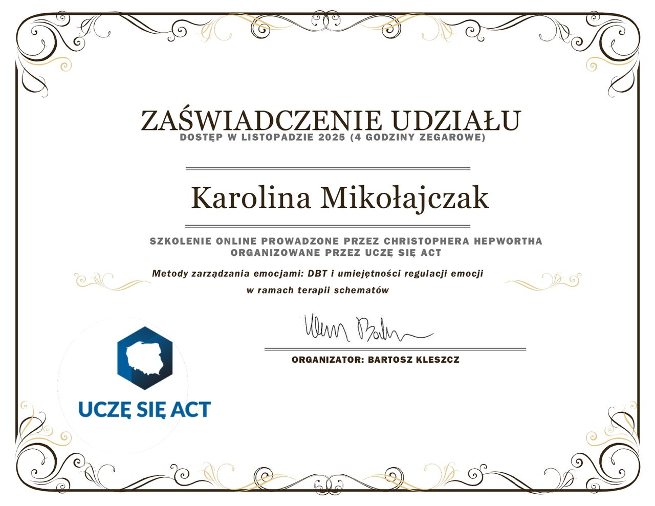 Jestem członkinią ACBS i ACBS Polska, co zapewnia dostęp do najnowszej wiedzy i narzędzi w nurtach kontekstualnych. Konsultacje i treningi ACT są odpowiednie dla osób szukających praktycznego wsparcia w radzeniu sobie ze stresem, trudnymi emocjami, wypaleniem zawodowym oraz wyzwaniami związanymi z ADHD.