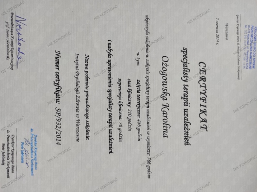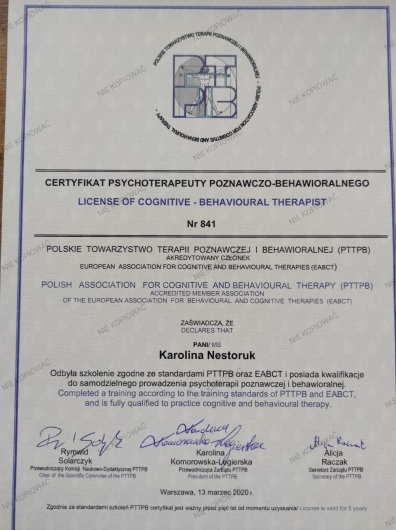 Jestem członkiem Polskiego Towarzystwa Psychoterapii Poznawczo Behawioralnej im. prof. Zdzisława Bizonia