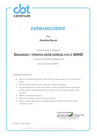 Czy Karolina Nocoń przyjmuje online, bez konieczności pojawiania się w placówce?Tak, Karolina Nocoń oferuje konsultacje online. Wybierz opcję „konsultacja online” przy umawianiu wizyty, a zobaczysz dostępne terminy.