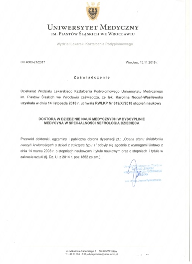 Stopień naukowy uzyskałam w 2018 r. na podstawie wyróżnionej pracy doktorskiej w specjalności nefrologia dziecięca. Specjalizację zdobyłam w Klinice Nefrologii Pediatrycznej we Wrocławiu, po ukończeniu studiów na Wydziale Lekarskim Uniwersytetu Medycznego we Wrocławiu w 2008 r.