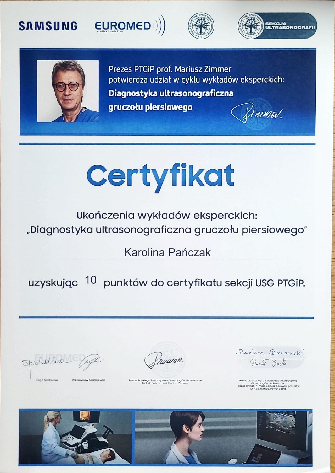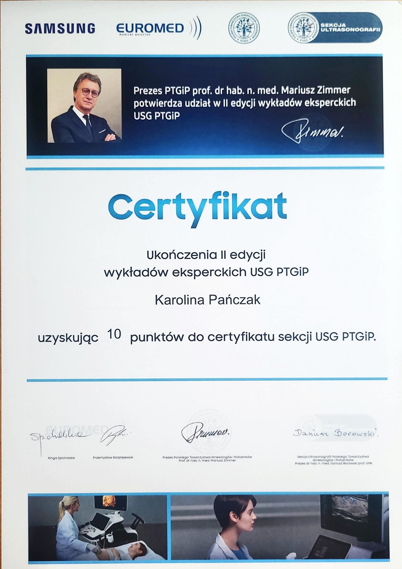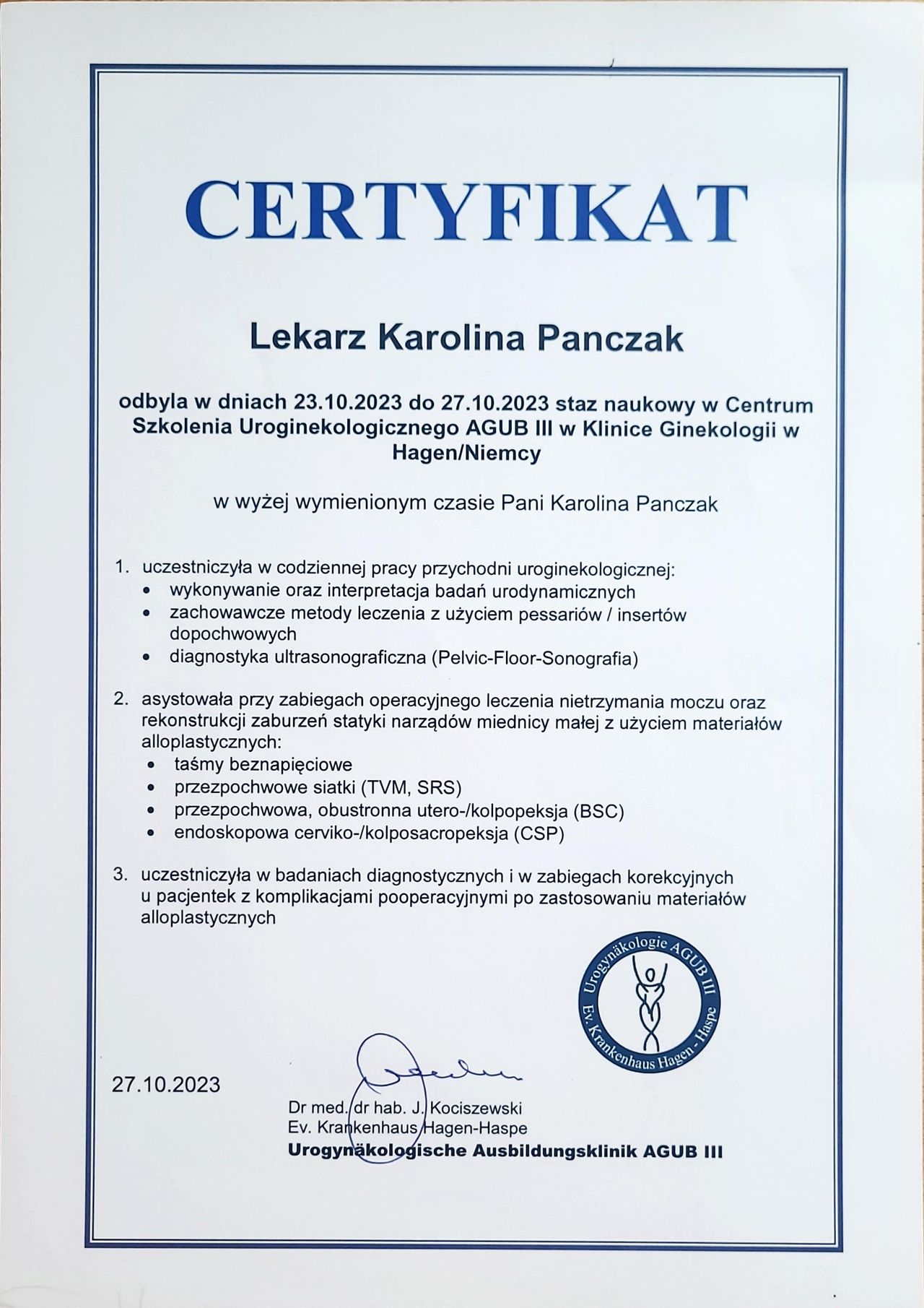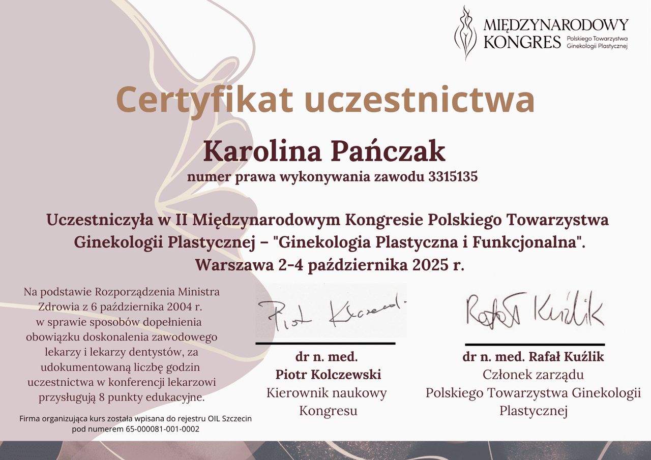 Od lat stale podnoszę swoje kwalifikacje, biorę udział w kursach, szkoleniach i warsztatach zarówno w Polsce, jak i w Niemczech. Jestem członkinią wielu towarzystw naukowych (PTGiP, DGGG, AGUB, IUGA, EUGA, ESGE oraz AGE), a także certyfikowaną kolposkopistką w Polsce i Niemczech.