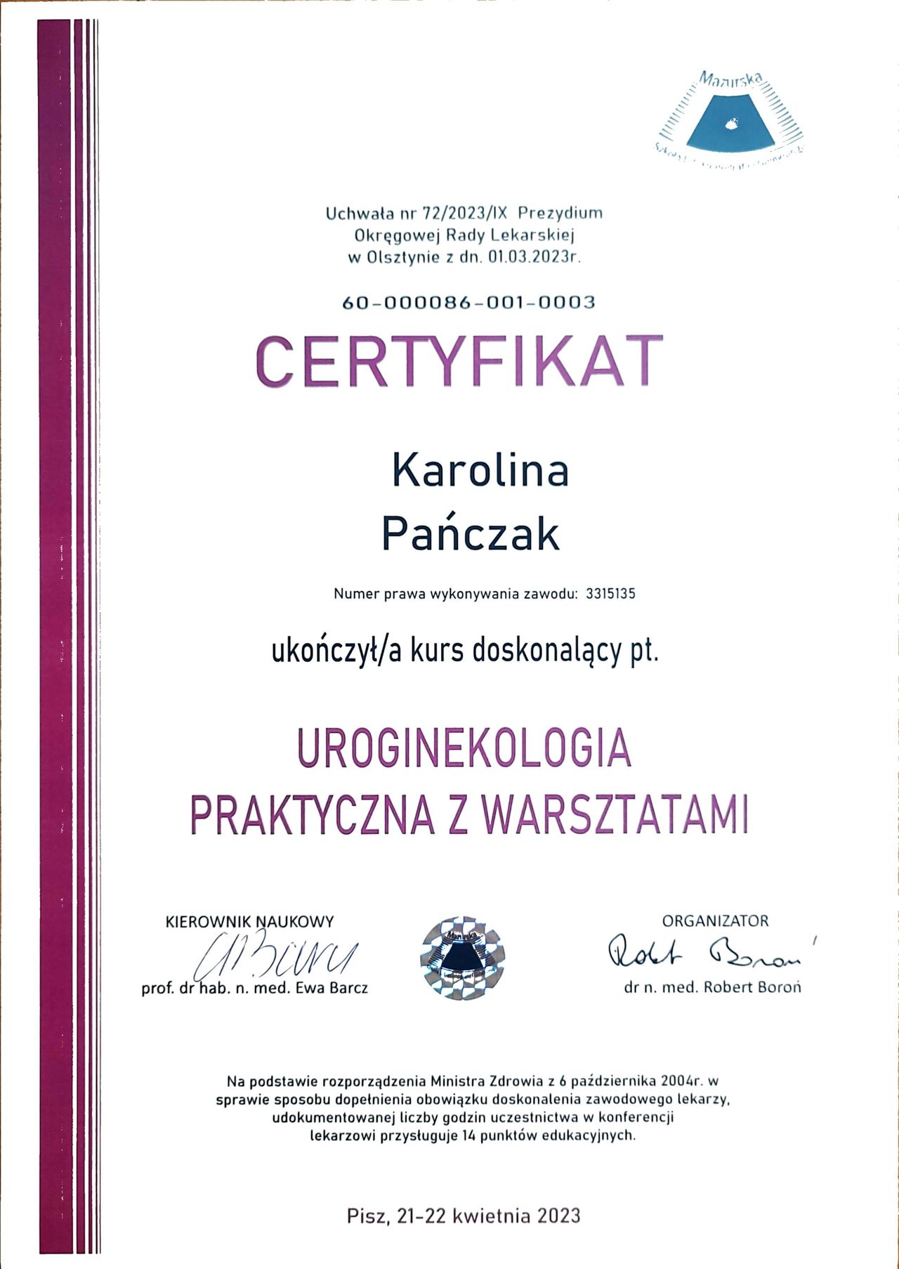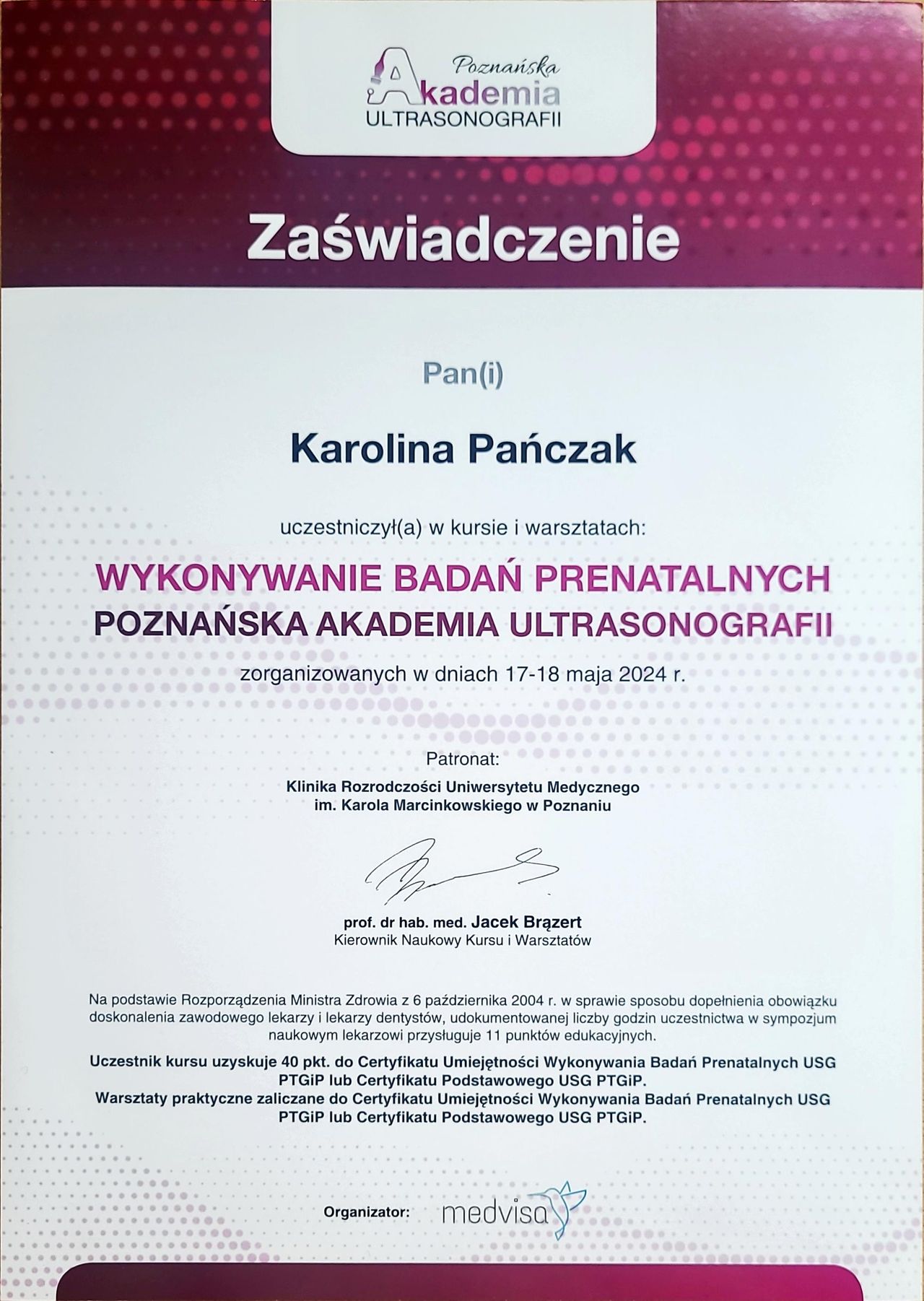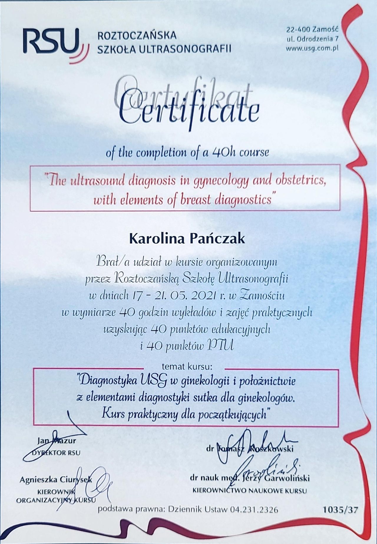 Od lat stale podnoszę swoje kwalifikacje, biorę udział w kursach, szkoleniach i warsztatach zarówno w Polsce, jak i w Niemczech. Jestem członkinią wielu towarzystw naukowych (PTGiP, DGGG, AGUB, IUGA, EUGA, ESGE oraz AGE), a także certyfikowaną kolposkopistką w Polsce i Niemczech.