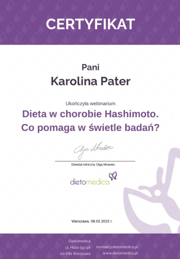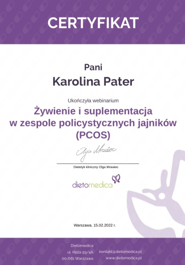 nazywam się Karolina Pater, jestem dietetykiem klinicznym i zawodowo zajmuję się pracą z pacjentami, którym staram się przywrócić świadomą i zdrową relację z jedzeniem.