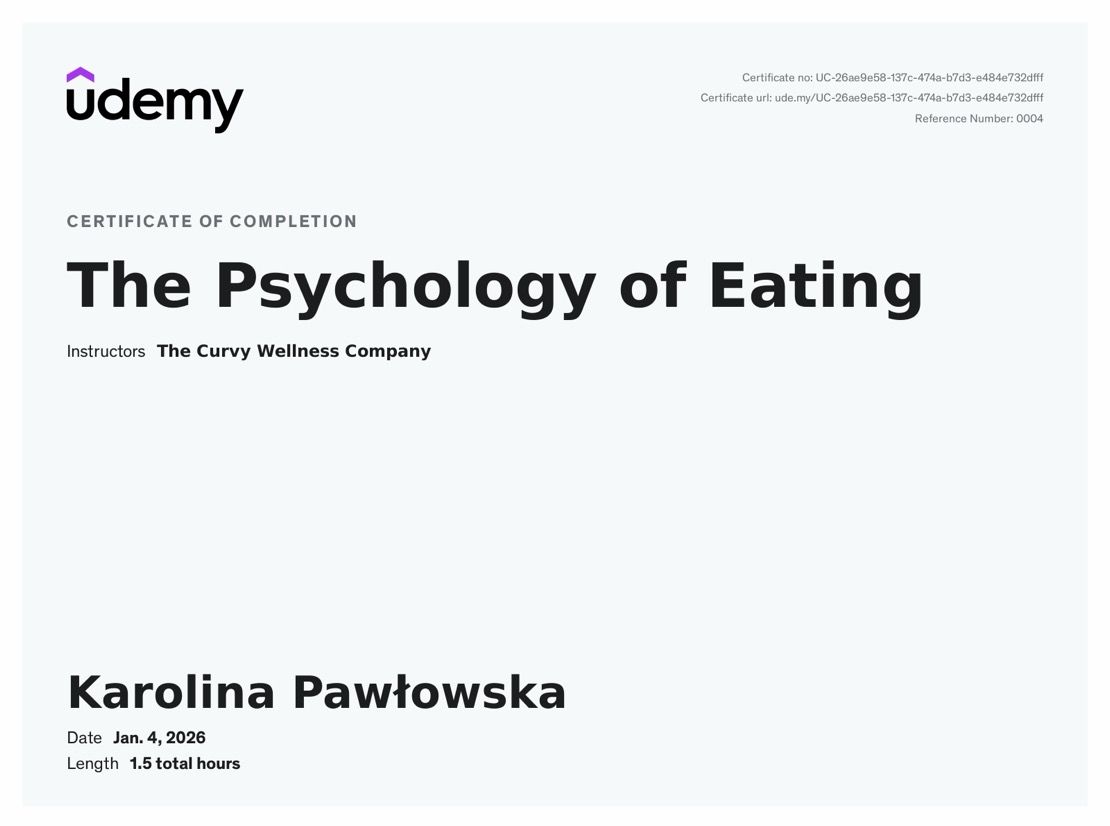 Mam za sobą setki przeprowadzonych konsultacji oraz ułożonych planów żywieniowych. Stale podnoszę swoje kwalifikacje, uczestnicząc w szkoleniach i zdobywając nowe certyfikaty, aby pracować w oparciu o aktualną wiedzę i praktykę kliniczną.