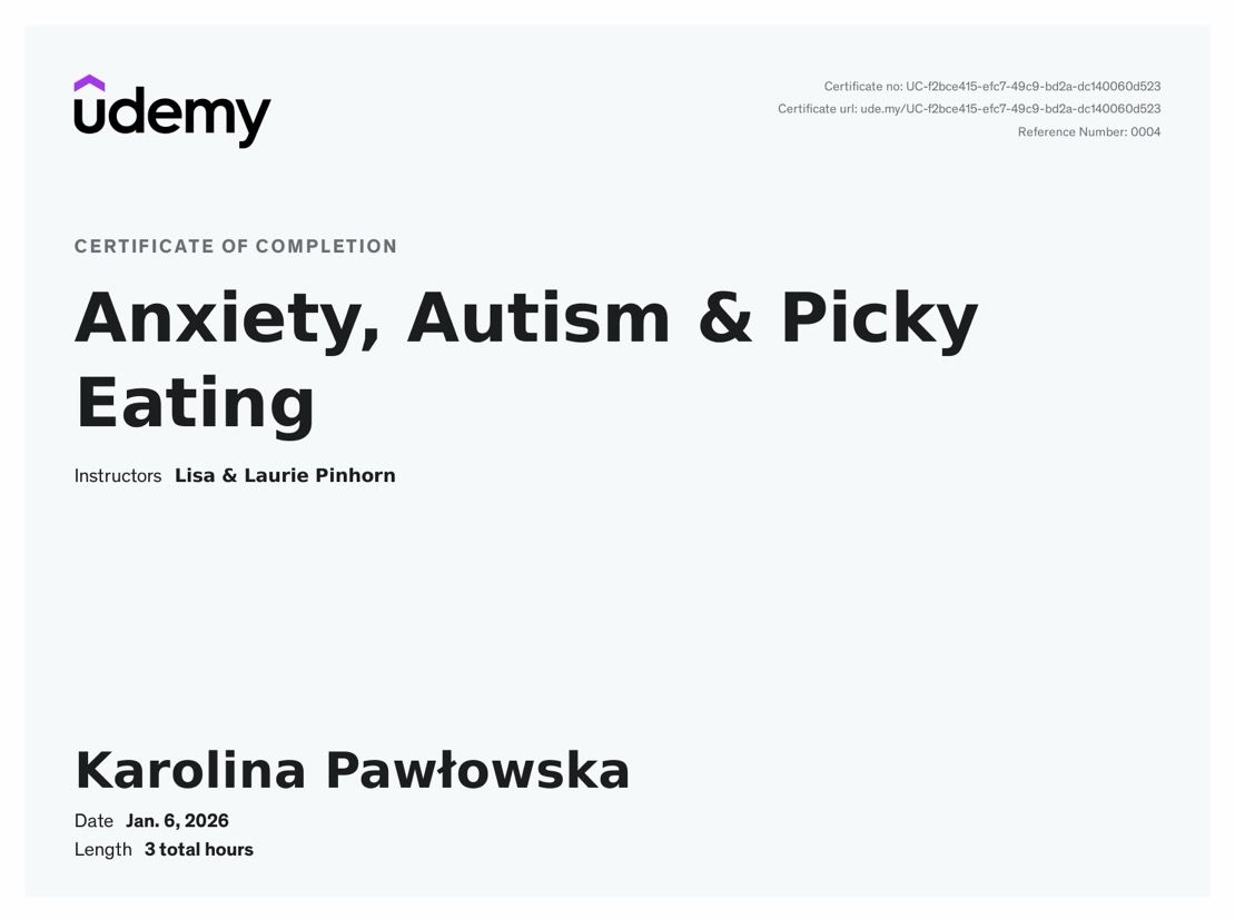 Praca z dziećmi to dla mnie ogromna przyjemność, a jeszcze większą radością jest obserwować, jak krok po kroku pokonują wybiórczość i zaczynają jeść odważniej i zdrowiej.