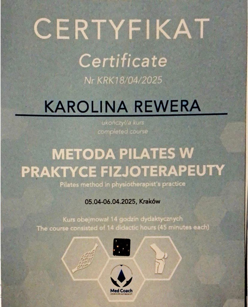 W swojej pracy łączę rzetelną diagnostykę, terapię manualną oraz prace z metodą Pilates, który stanowi bezpieczną i skuteczną formę ruchu wspierającą stabilizację centralną, prawidłowy oddech oraz świadomą pracę mięśni dna miednicy. Zajęcia pilates prowadzę zarówno indywidualnie, zawsze dostosowując program do potrzeb i możliwości pacjentki.