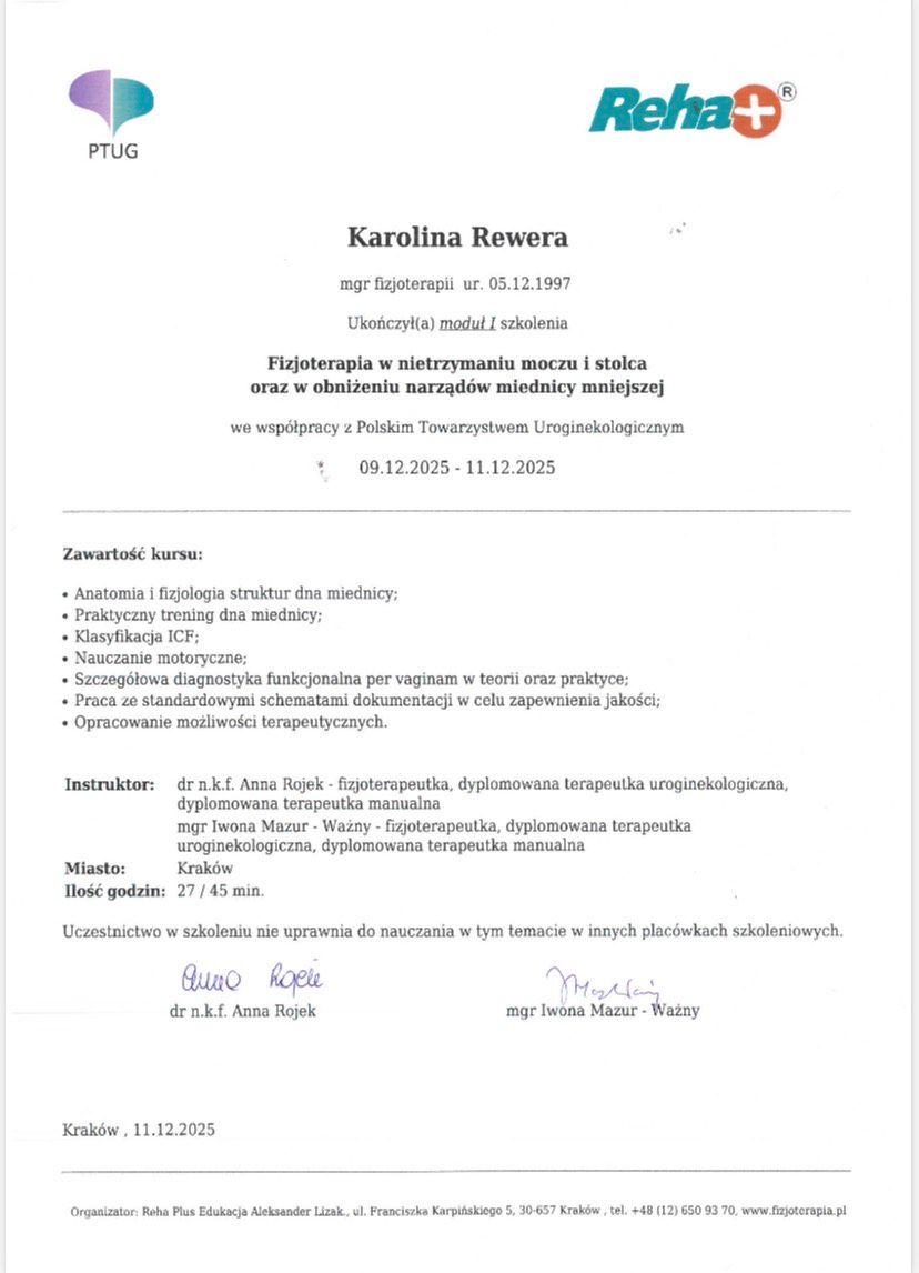 Jestem dyplomowaną fizjoterapeutką uroginekologiczną, specjalizującą się w pracy z kobietami na różnych etapach życia — od okresu dojrzewania, przez ciążę i połóg, aż po czas okołomenopauzalny. Pomagam w terapii dysfunkcji dna miednicy, takich jak nietrzymanie moczu, obniżenia narządów miednicy, bolesne miesiączki, dolegliwości bólowe miednicy oraz w przygotowaniu do porodu i powrocie do sprawności po porodzie.