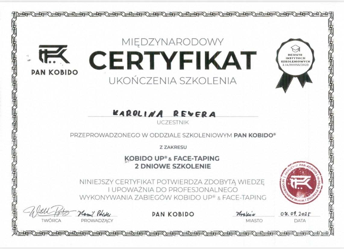 Jestem również certyfikowaną terapeutką masażu Kobido — japońskiej techniki manualnej, uznawanej za naturalny lifting twarzy. Zabieg łączy precyzyjne, dynamiczne ruchy z głęboką pracą na tkankach, co pozwala poprawić napięcie skóry, zrelaksować mięśnie twarzy oraz przywrócić jej zdrowy, promienny wygląd.