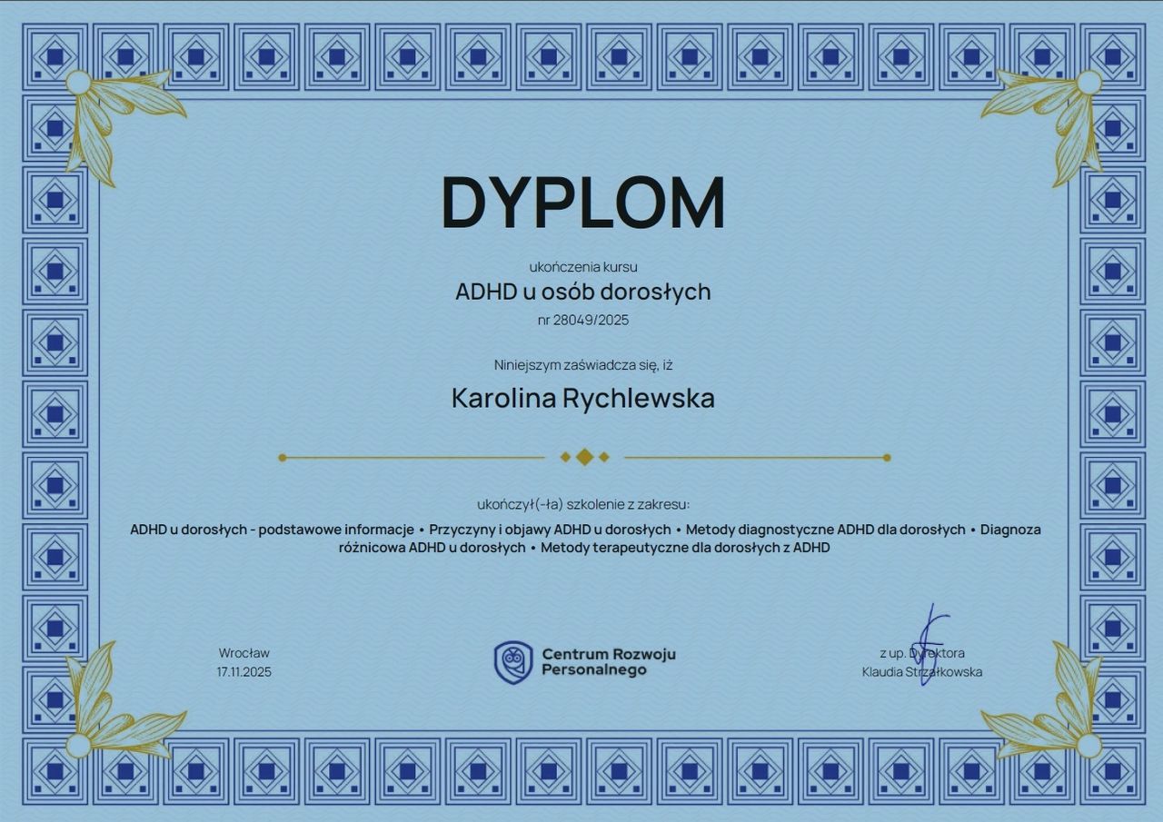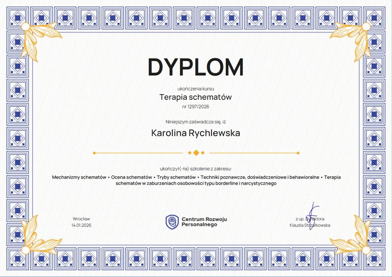 Nazywam się Karolina Rychlewska. Jestem psychologiem oraz psychotraumatologiem. Ukończyłam studia magisterskie z psychologii, a także studia podyplomowe z psychotraumatologii oraz przygotowania pedagogicznego dla psychologów.