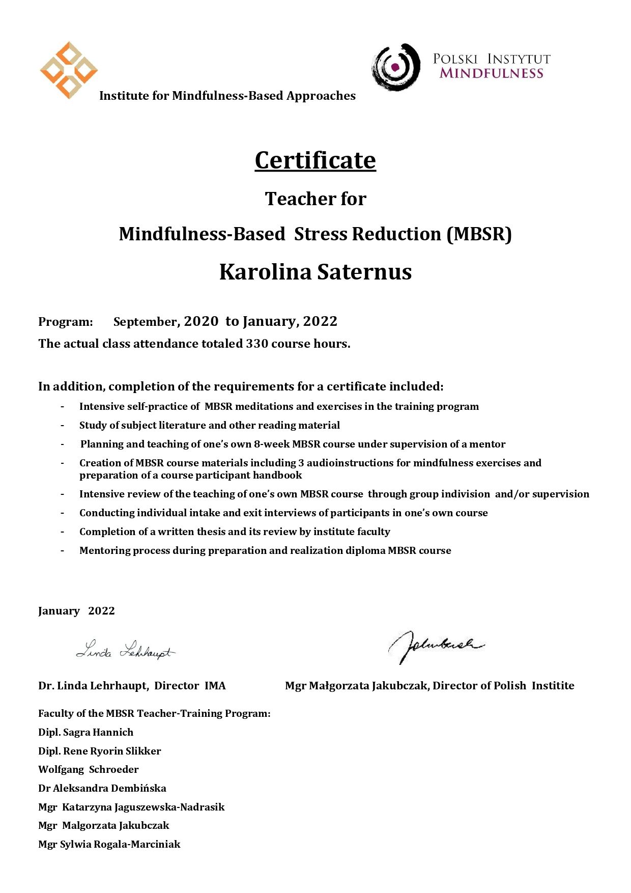 Jestem także certyfikowaną nauczycielką uważności, programu Mindfulness-Based Stress Reduction (MBSR) po 2-letnim Studium Nauczycielskim w The Institute for Mindfulness-Based Approaches przy współpracy z Polskim Instytutem Mindfulness.