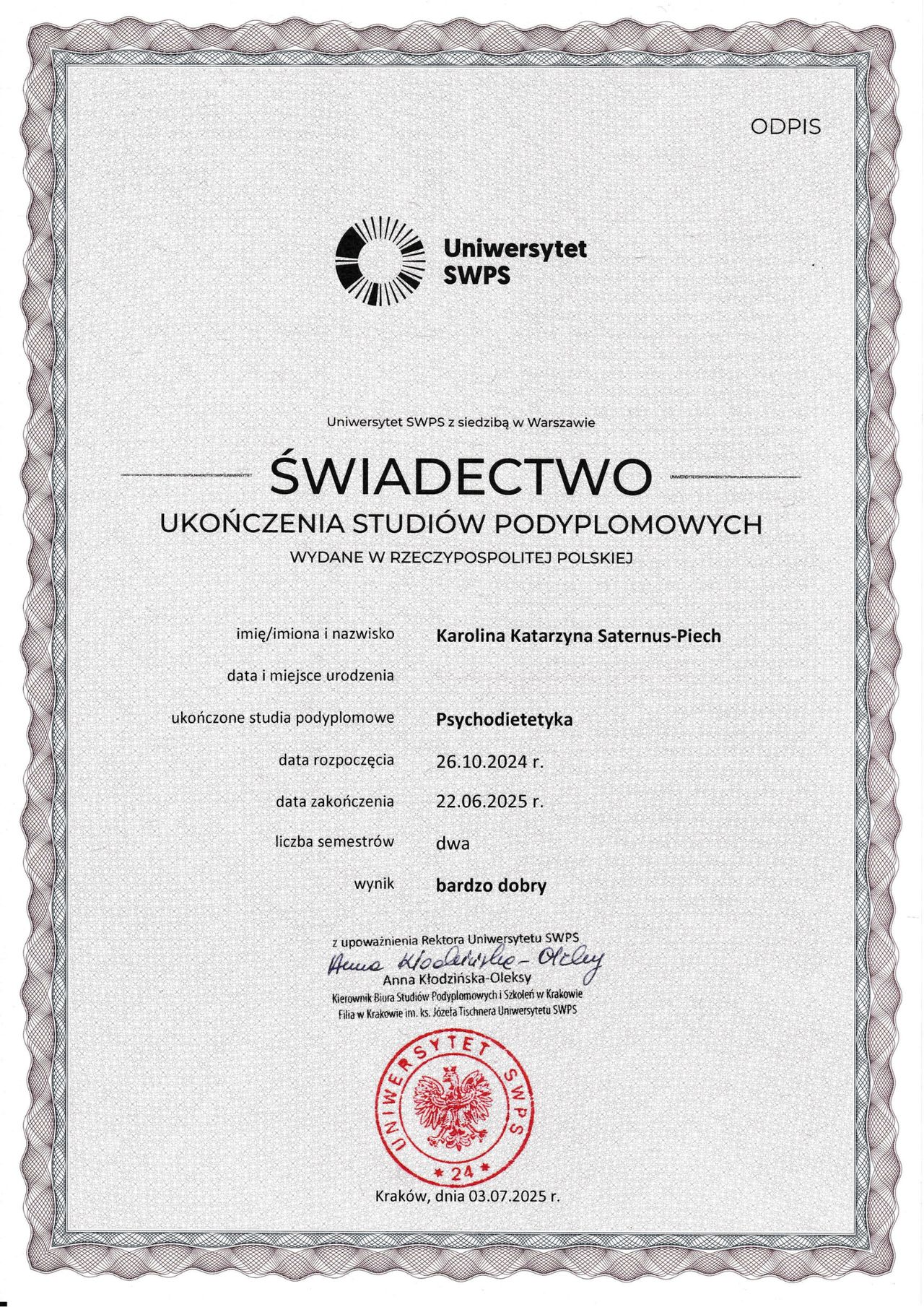 Ukończyłam kurs instruktorski na trenera oddechowego metodą Butejki współprowadzonym przez Patricka McKeown oraz studia podyplomowe na kierunku Psychodietetyka Uniwersytetu SWPS.