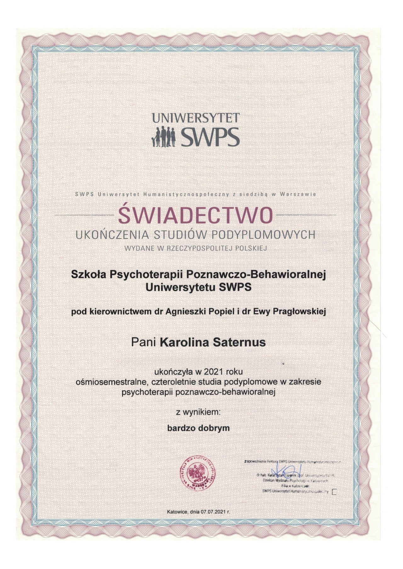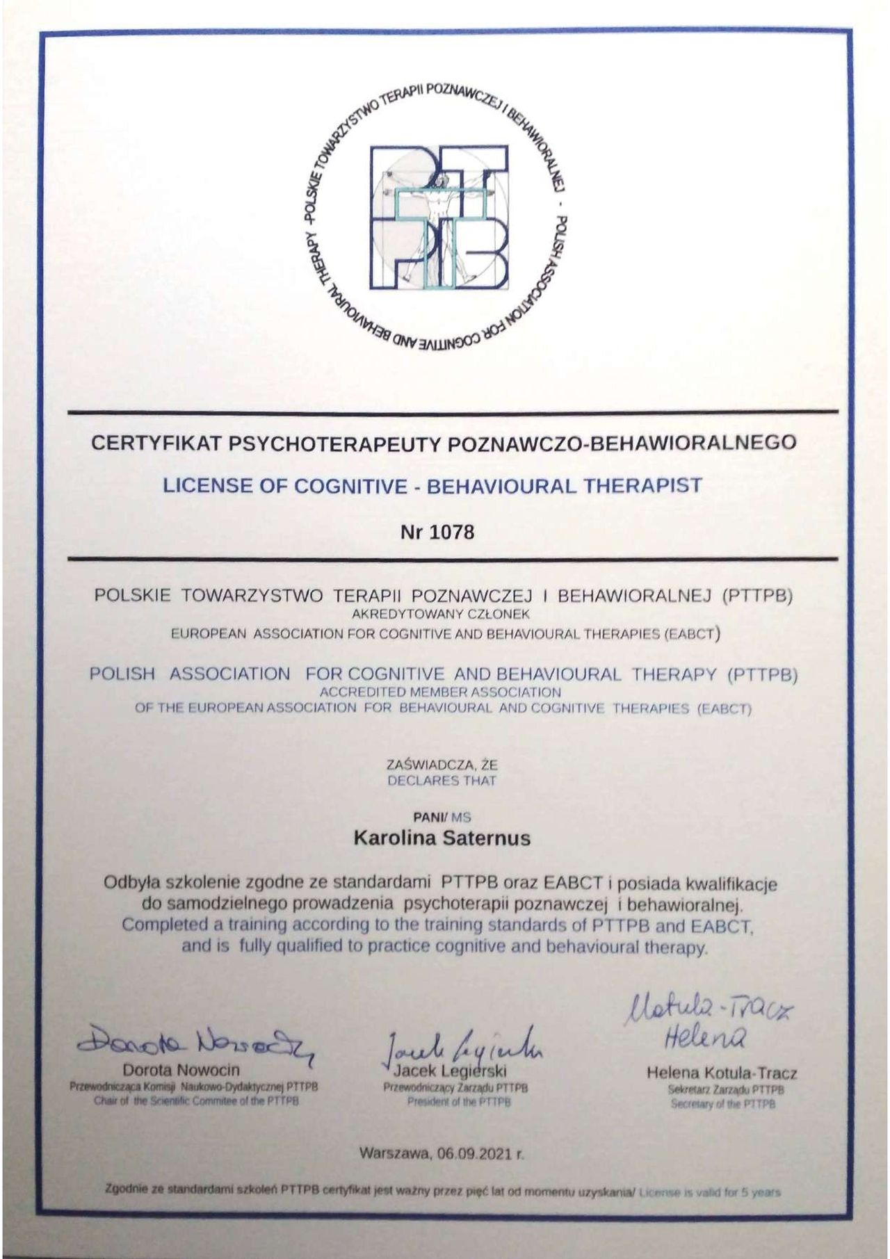 Jestem psychoterapeutką poznawczo-behawioralną z certyfikatem nr 1078 akredytowanym przez Polskie Towarzystwo Terapii Poznawczej i Behawioralnej. Ukończyłam 4-letnią Szkołę Psychoterapii Poznawczo-Behawioralnej Uniwersytetu SWPS.