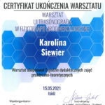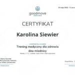 Skończyłam kursy w zakresie: medycznego treningu w ciąży, treningu medycznego dna miednicy. Masaż tkanek głębokich oraz kurs kinesiology taping. Ukończyłam warsztaty z rozejścia mięśnia prostego brzucha, ultrasonografii w fizjoterapii uroginekologicznej, a także pessaroterapii stosowanej w obniżeniu narządów miednicy mniejszej. Ponadto jestem trenerem rolowania Blackroll.