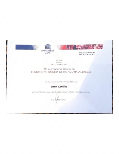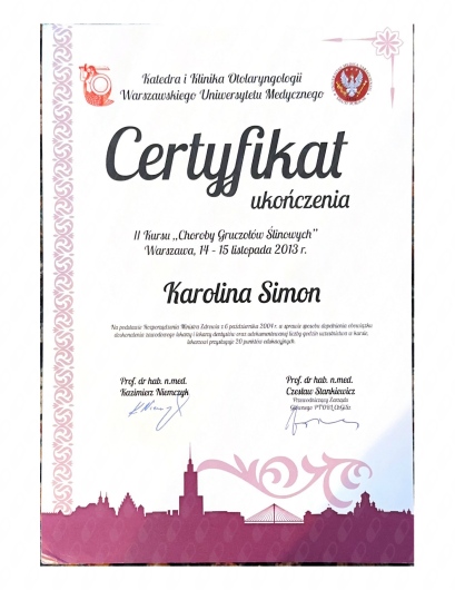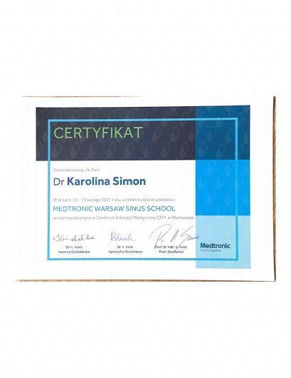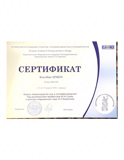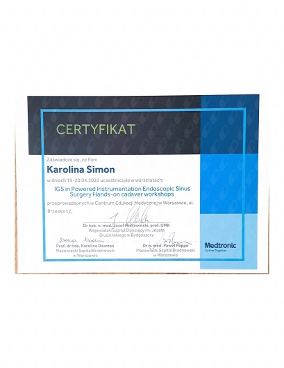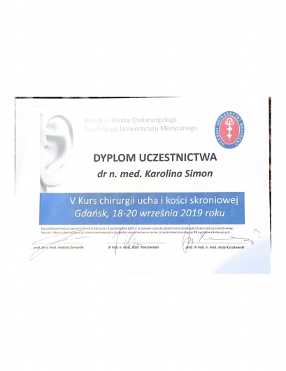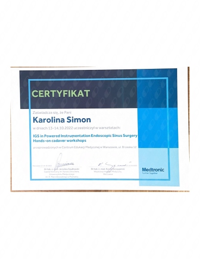 Ukończyłam liczne kursy międzynarodowe w zakresie operacji endoskopowych zatok (metodą FES), kursy operacji usznych, operacji szyi oraz operacji plastycznych twarzy.