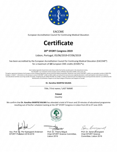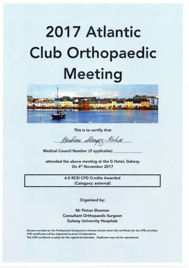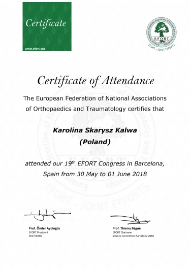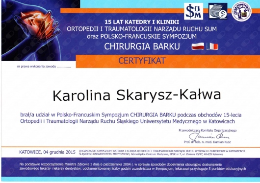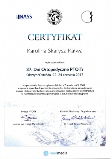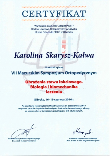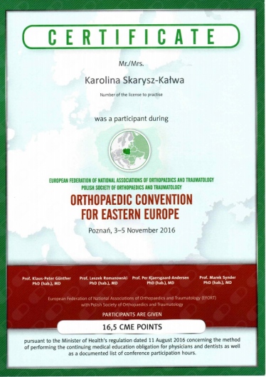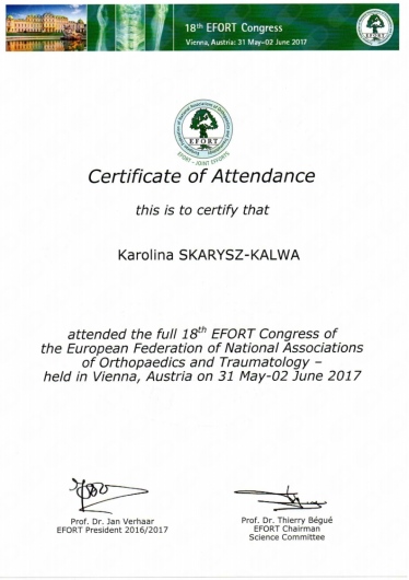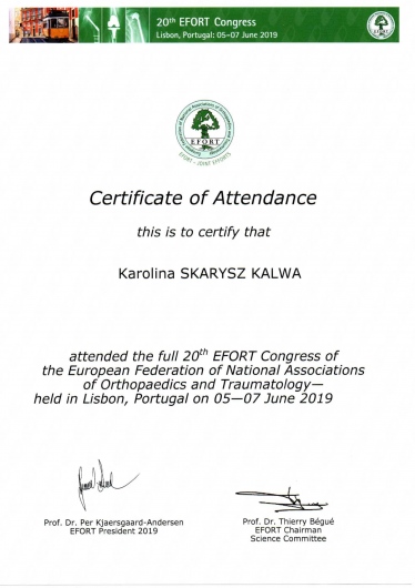 Każdego roku przechodzę szereg kursów i szkoleń. Co najmniej raz w roku uczestniczę w krajowych i zagranicznych sympozjach ortopedycznych oraz kształcę się na kursach kadawerowych (w dziedzinie artroskopii i endoprotezoplattykis stawu ramiennego) oraz szkolę się również poza granicami kraju - w roku 2019 tydzień szkoliłam się w Mediolanie.