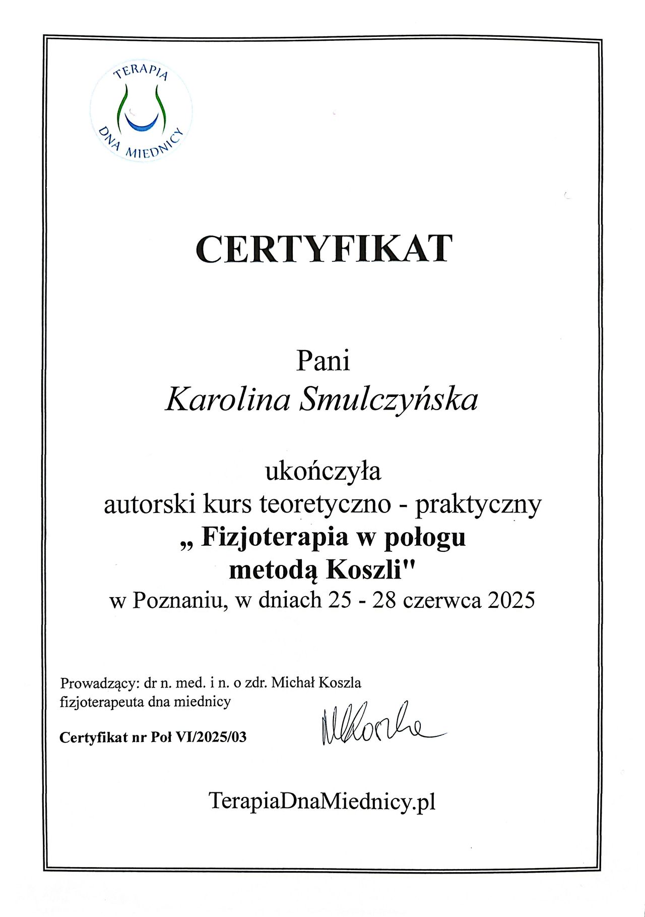 Pani Karolina to świetna specjalistka – kompetentna, uważna i bardzo zaangażowana. Już podczas pierwszej wizyty dokładnie przeanalizowała mój problem, wytłumaczyła wszystko w przystępny sposób i zaproponowała skuteczną terapię. Efekty zauważyłam szybciej, niż się spodziewałam! Do tego bardzo miła i spokojna atmosfera, dzięki której czułam się komfortowo i zaopiekowana. Z czystym sumieniem polecam Panią Karolinę każdemu, kto szuka fachowej i empatycznej pomocy fizjoterapeutycznej.