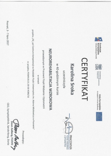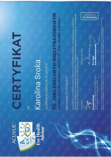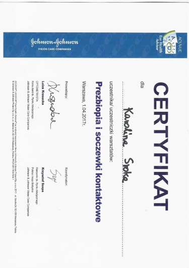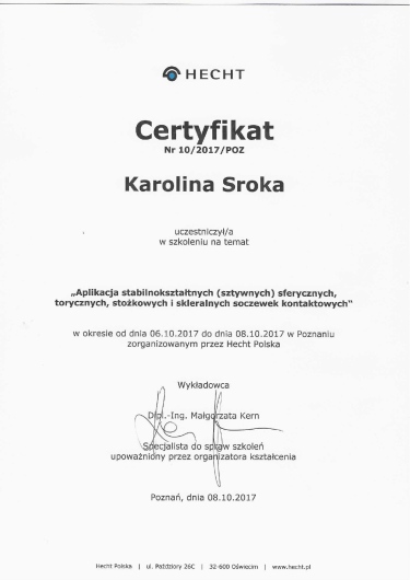 Jaki jest zakres porad oferowanych przez Karolina Sroka?Karolina Sroka to optometrysta. Na podstawie swojego doświadczenia i wykształcenia Karolina Sroka oferuje usługi takie jak: Badanie wzroku u dorosłych, Badanie oraz dobór soczewek kontaktowych, badania diagnostyczne, trening wzrokowy w zaburzeniach widzenia obuocznego, Przygotowanie ćwiczeń domowych, Wybarwienie przy soczewkach kontaktowych, Badanie wzroku u dzieci powyżej 13 roku życia.