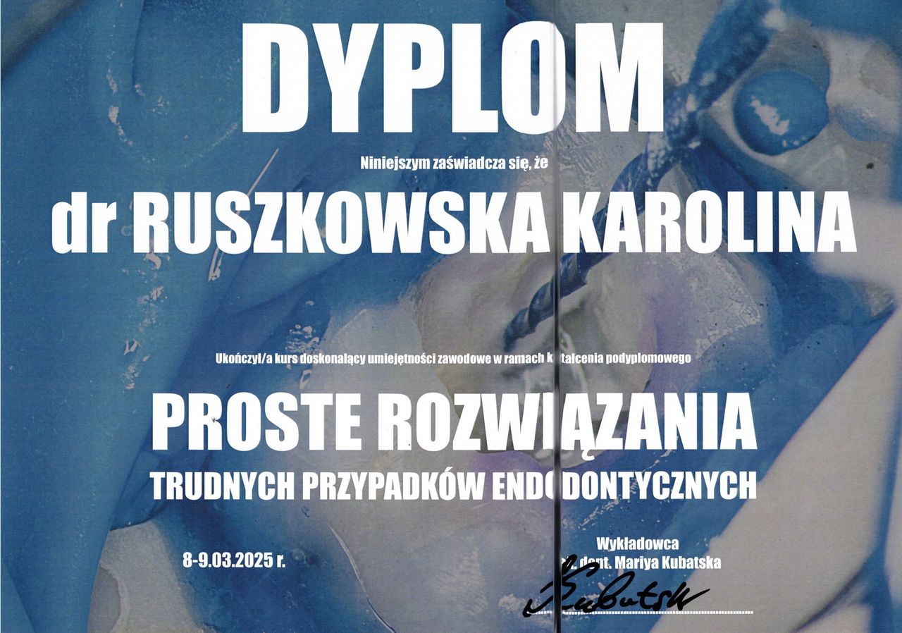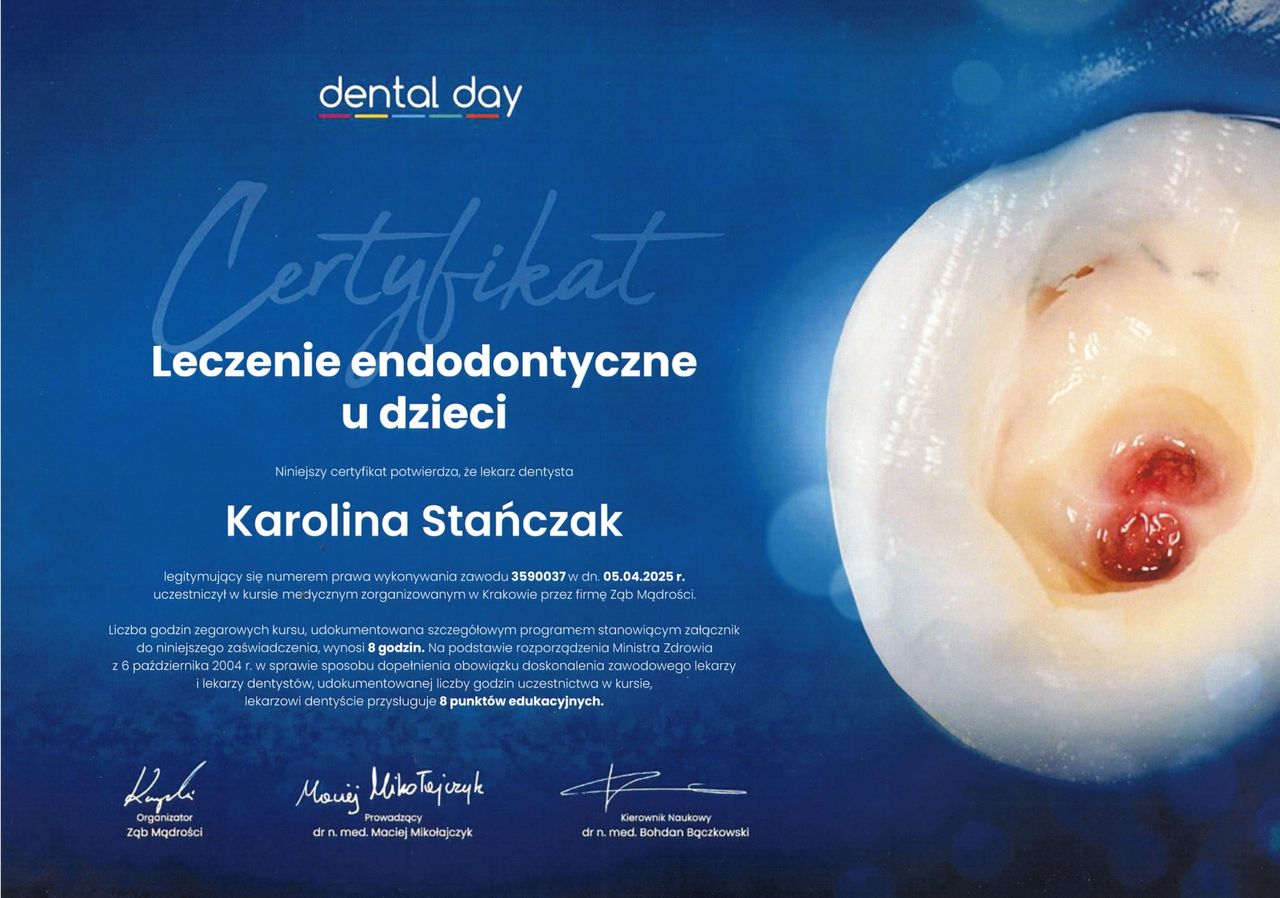 Jestem niezwykle wdzięczny za profesjonalne podejście i opiekę, jaką otrzymałem podczas leczenia kanałowego. Pani Karolina wykazała się nie tylko ogromną wiedzą i precyzją, ale przede wszystkim niesamowitą empatią i spokojem, które pomogły mi przejść przez ten zabieg bez stresu. Każdy etap leczenia został mi dokładnie wyjaśniony, co dało mi poczucie bezpieczeństwa i zaufania. Jestem pod ogromnym wrażeniem szczegółowej analizy mojego przypadku oraz jasnego przedstawienia planu działania. Serdecznie dziękuję i z czystym sumieniem polecam wszystkim, którzy szukają stomatologa z powołania.