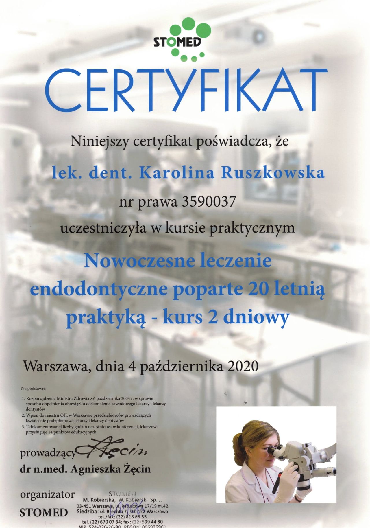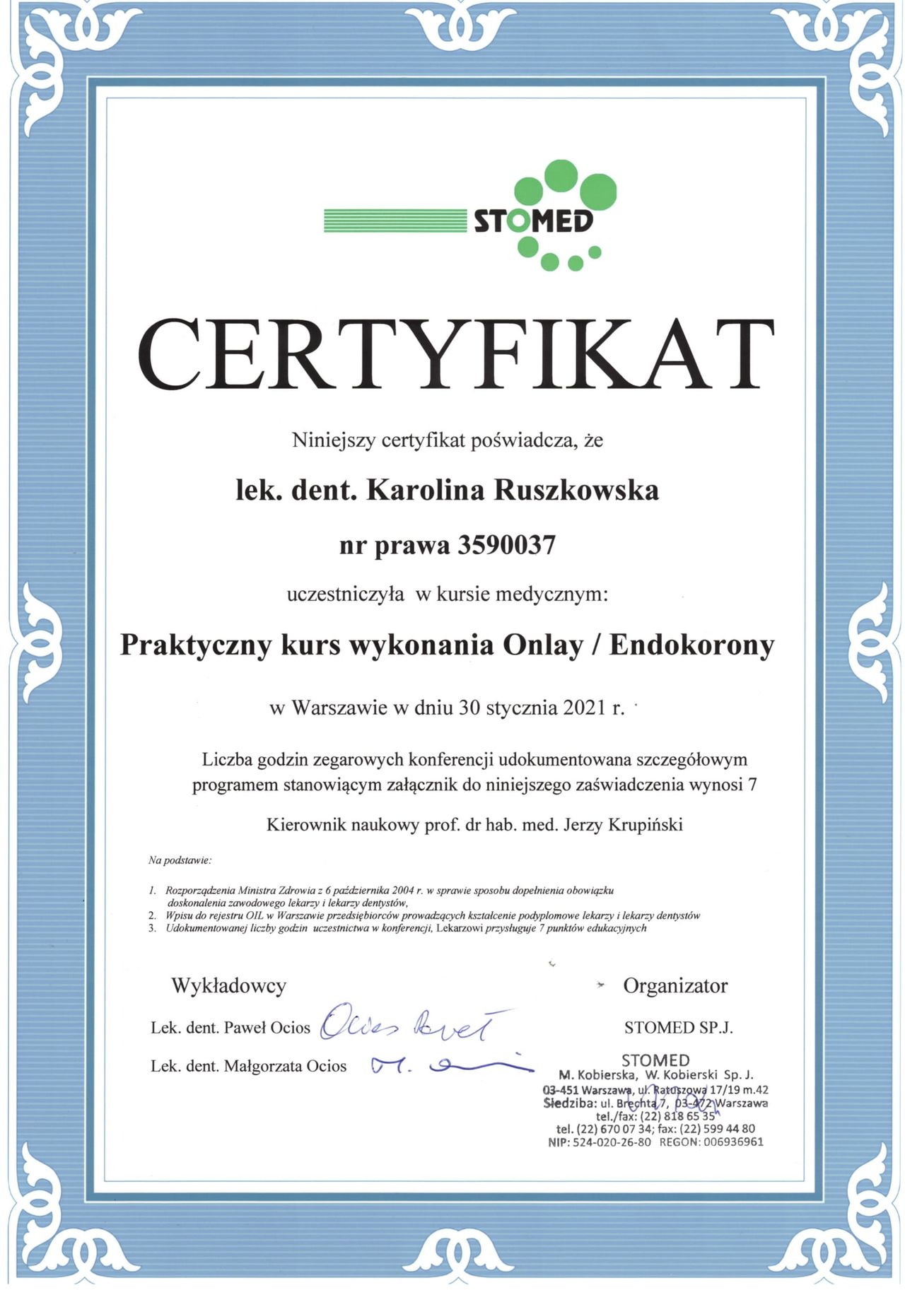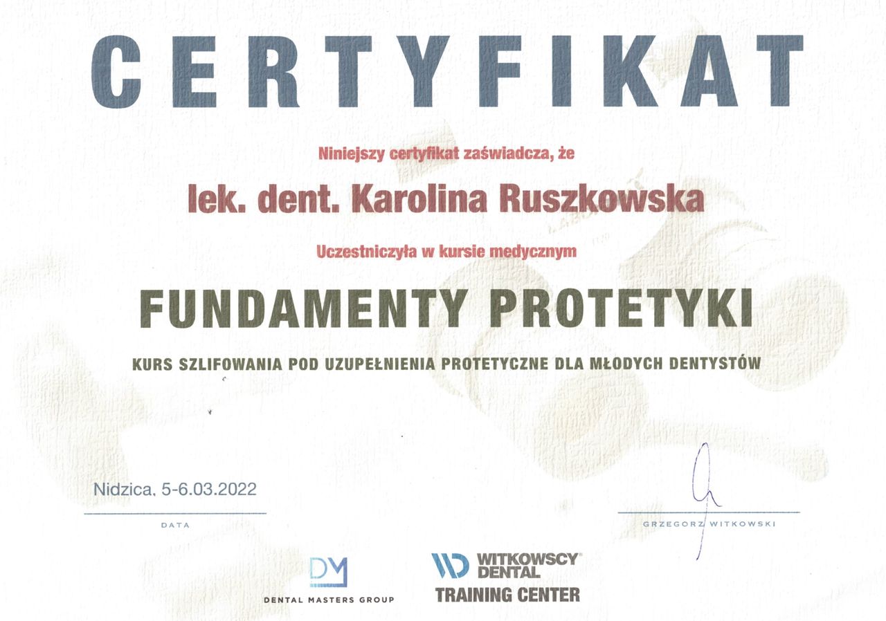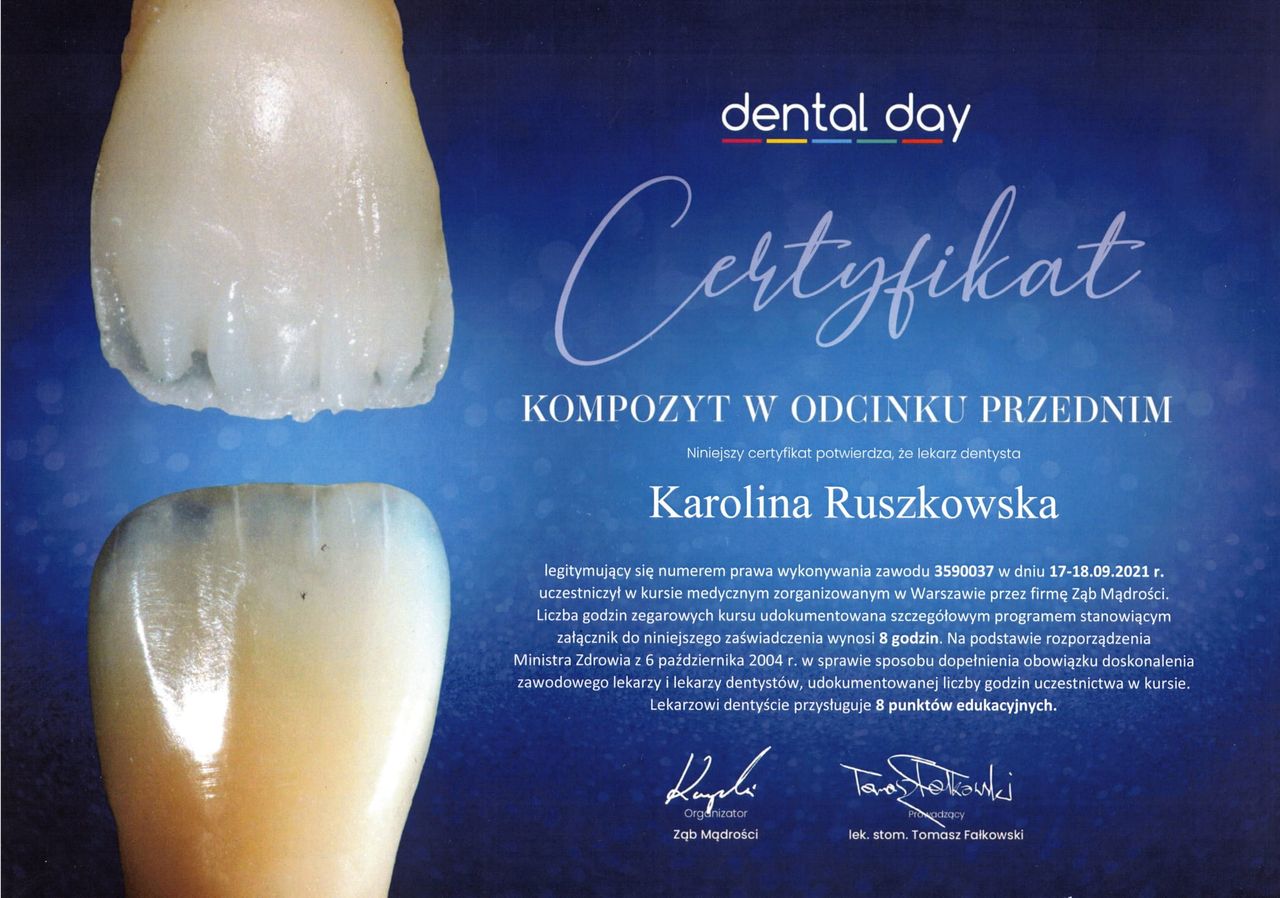Regularnie uczestniczę w specjalistycznych kursach, stale poszerzam swoją wiedzę i oferuję pacjentom najnowsze rozwiązania.