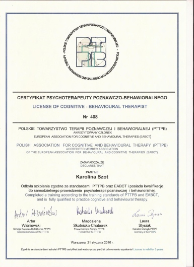 Uwaga, dużo czytania (opinia pozytywna). Na początku przyszłam z zamiarem przepracowania konkretnego problemu, nastawiona na określoną ilość wizyt (jak to sobie wyczytałam w internecie o CBT). Nie była to moja pierwsza wizyta u terapeuty, kiedyś odbyłam terapię w innym celu, uznałam, ze zakończyła się z zadowalającym efektem. Po pierwszej wizycie miałam pozytywne odczucia. Karolina ma taką lekkość w nawiązywaniu kontaktu z drugim człowiekiem, który sprawia, ze pacjent czuje się bezpiecznie i komfortowo. W domu wypełniłam kwestionariusze. Na kolejnej wizycie omówiłyśmy odpowiedzi których udzieliłam, przy okazji odpowiadałam na dodatkowe pytania, które zaczęły dotykać innych aspektów życia. Byłam zdecydowana na współpracę, wiedziałam, ze proces terapii nie należy do łatwych i przyjemnych. Muszę tu zaznaczyć, ze terapia to ciągła praca we własnym zakresie pod opieką i z pomocą terapeuty (samo chodzenie na sesje, „żeby się wygadać” raczej nie przynosi trwałego efektu, jest to zbyt płytkie - przerobiłam to). Z kolejnymi spotkaniami, po kilku miesiącach, z „szybkiej piłki”, z która przyszłam na początku zaczęły wyłaniać się inne, żeby nie powiedzieć - prawdziwe - powody, dla których trafiłam do gabinetu. Po nitce do kłębka :)