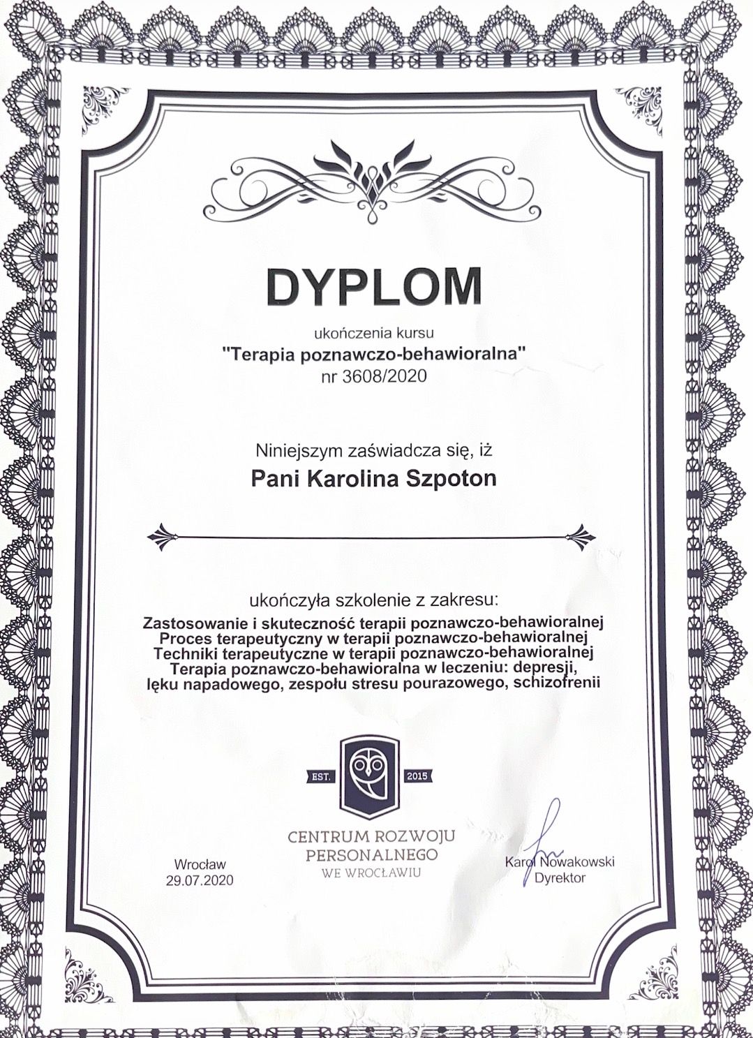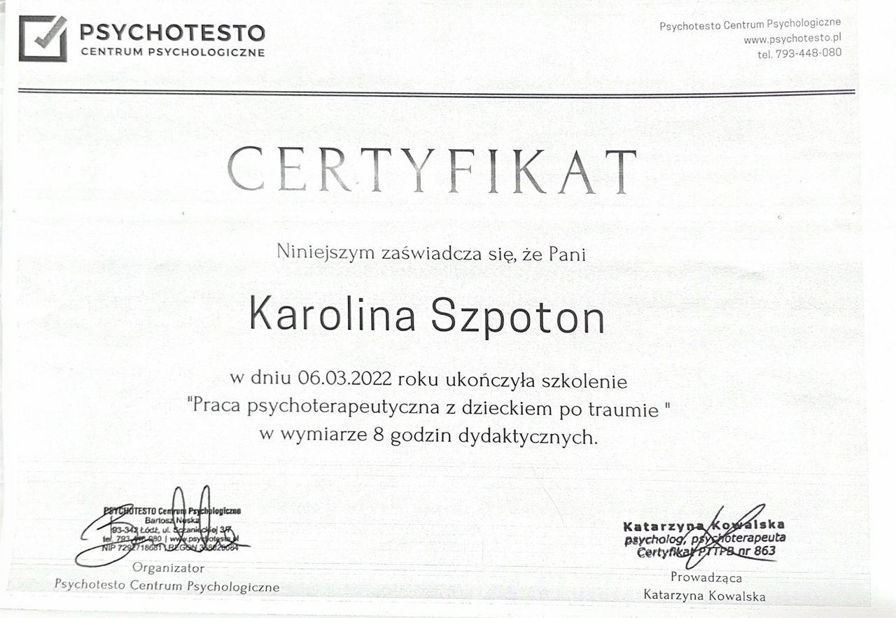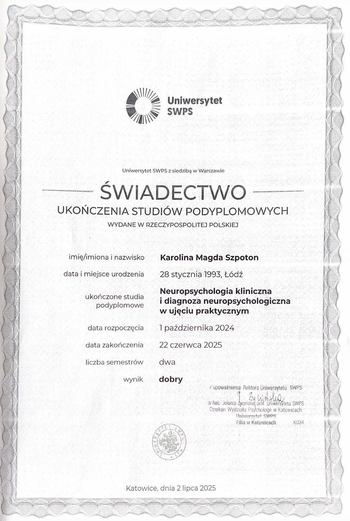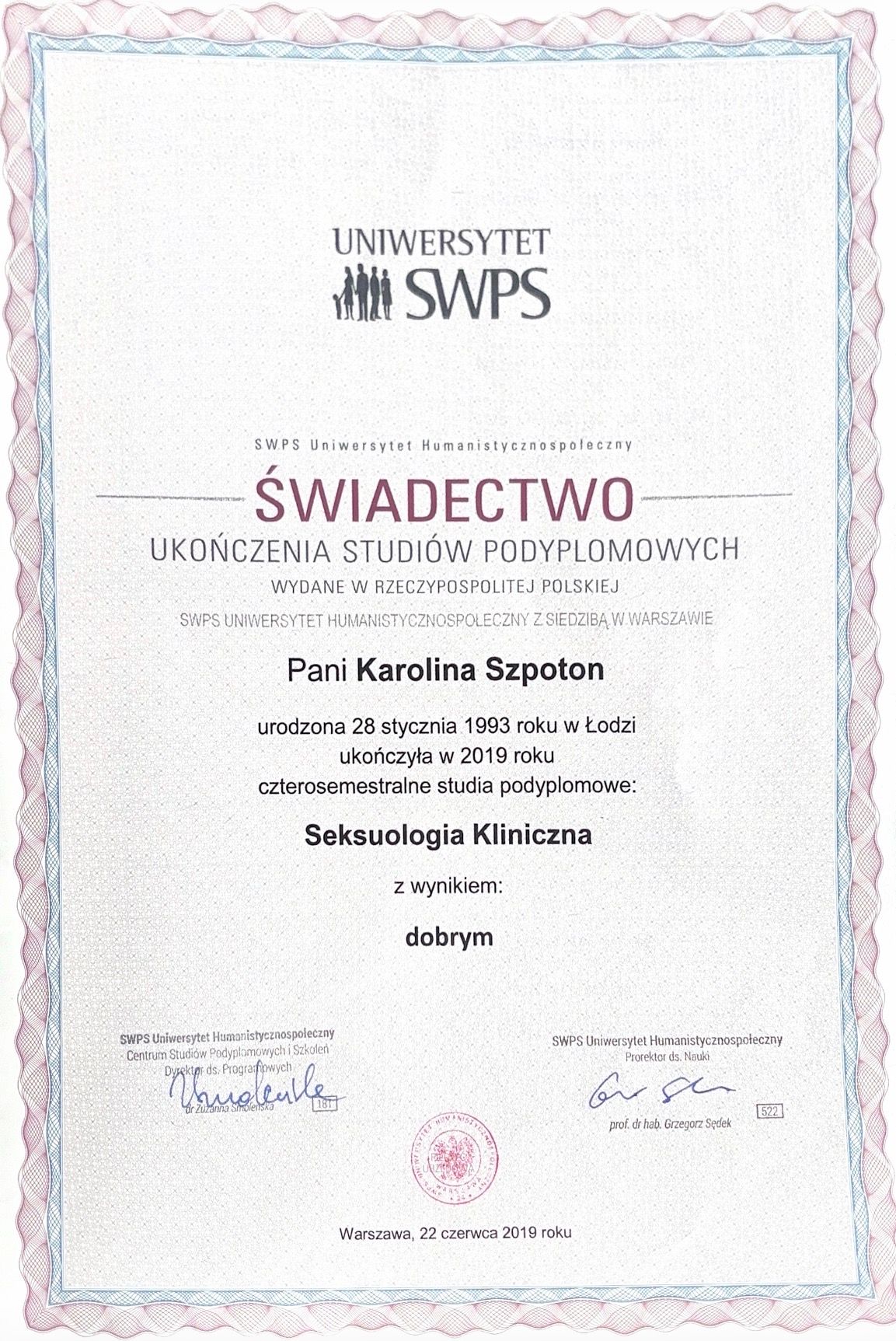 Ukończyłam studia podyplomowe z zakresu seksuologii klinicznej na Uniwersytecie Humanistyczno - Społecznym SWPS w Warszawie oraz pierwszy poziom terapii skoncentrowanej na rozwiązaniach. W ostatnim czasie ukończyłam studia podyplomowe w zakresie neuropsychologii klinicznej i diagnozy neuropsychologicznej w ujęciu praktycznym.