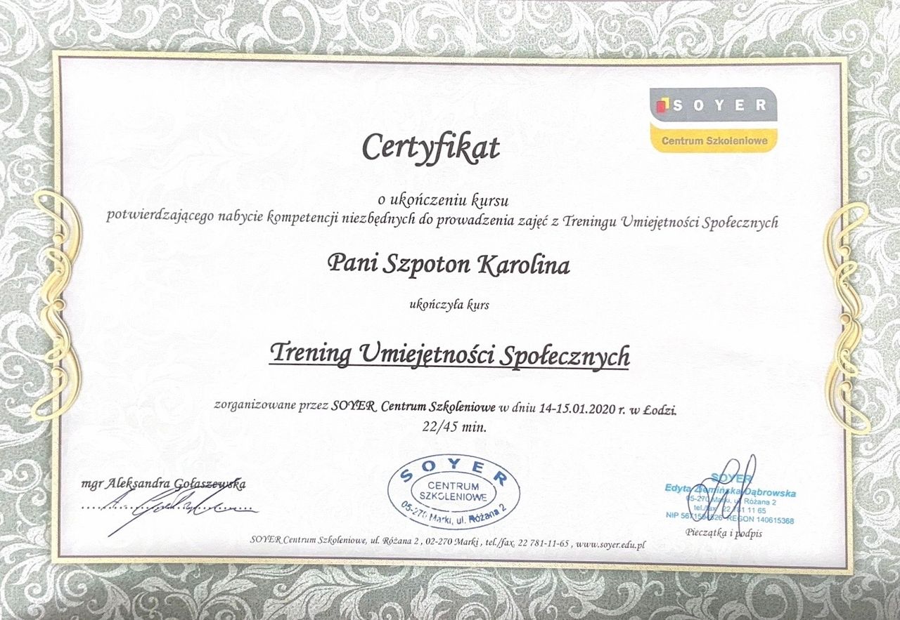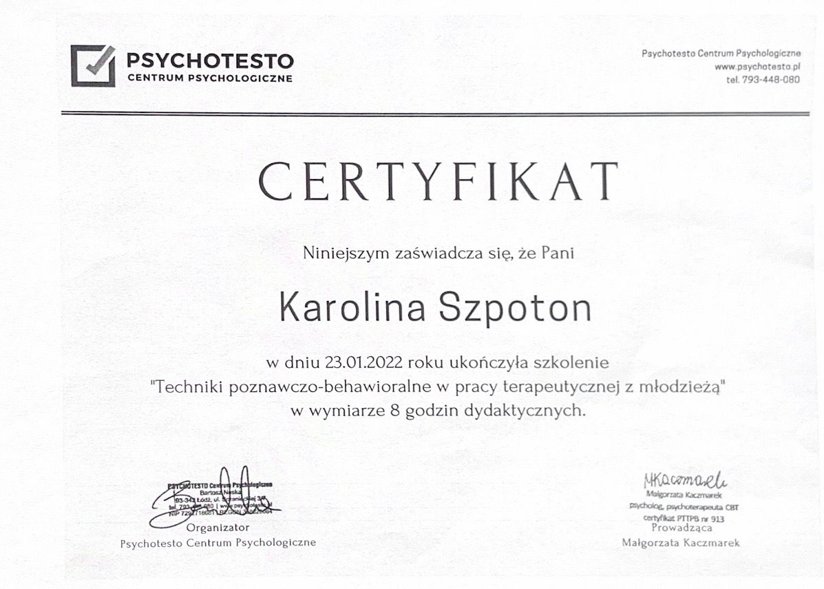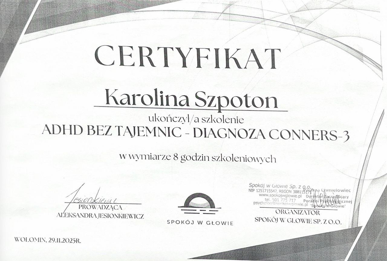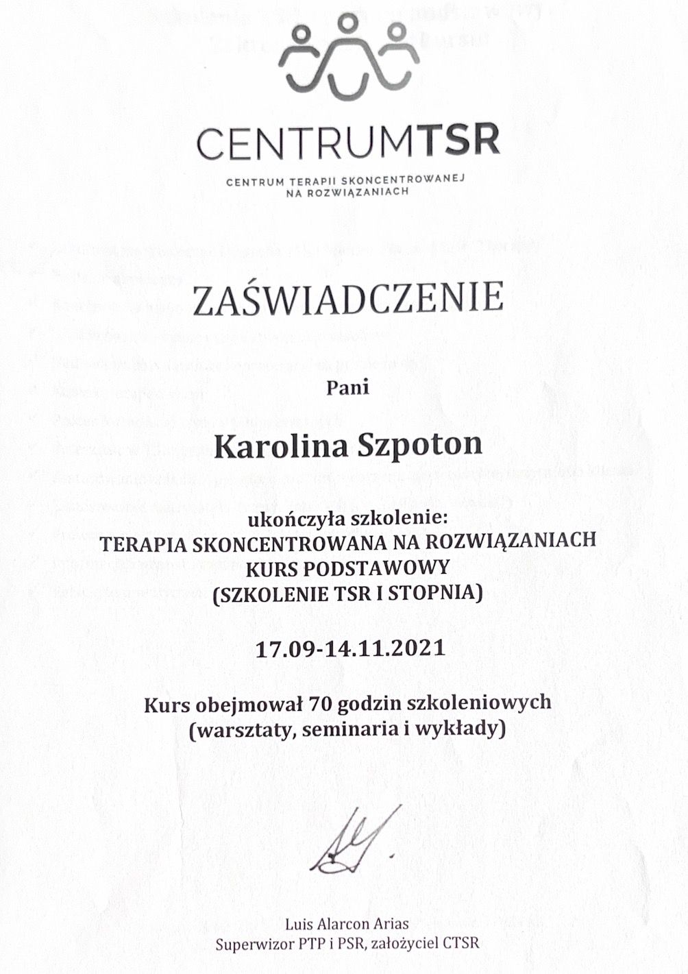 Ukończyłam studia podyplomowe z zakresu seksuologii klinicznej na Uniwersytecie Humanistyczno - Społecznym SWPS w Warszawie oraz pierwszy poziom terapii skoncentrowanej na rozwiązaniach. W ostatnim czasie ukończyłam studia podyplomowe w zakresie neuropsychologii klinicznej i diagnozy neuropsychologicznej w ujęciu praktycznym.