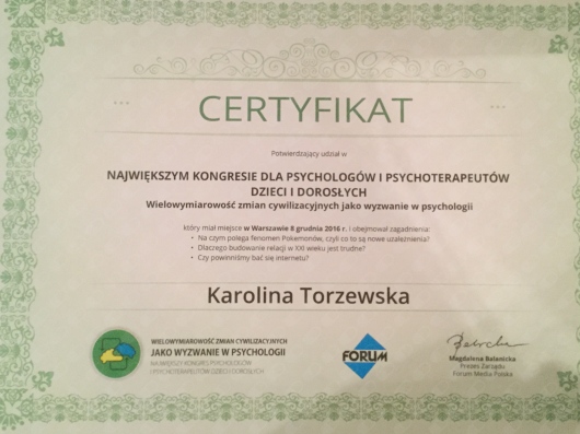 Ukończyłam podyplomowe studia SWPS Psychologia społeczna w praktyce.
