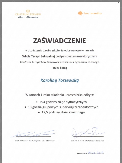 i w trakcie specjalizacji w Szkole Terapii Seksualnej Lwa-Starowicza w Warszawie.
