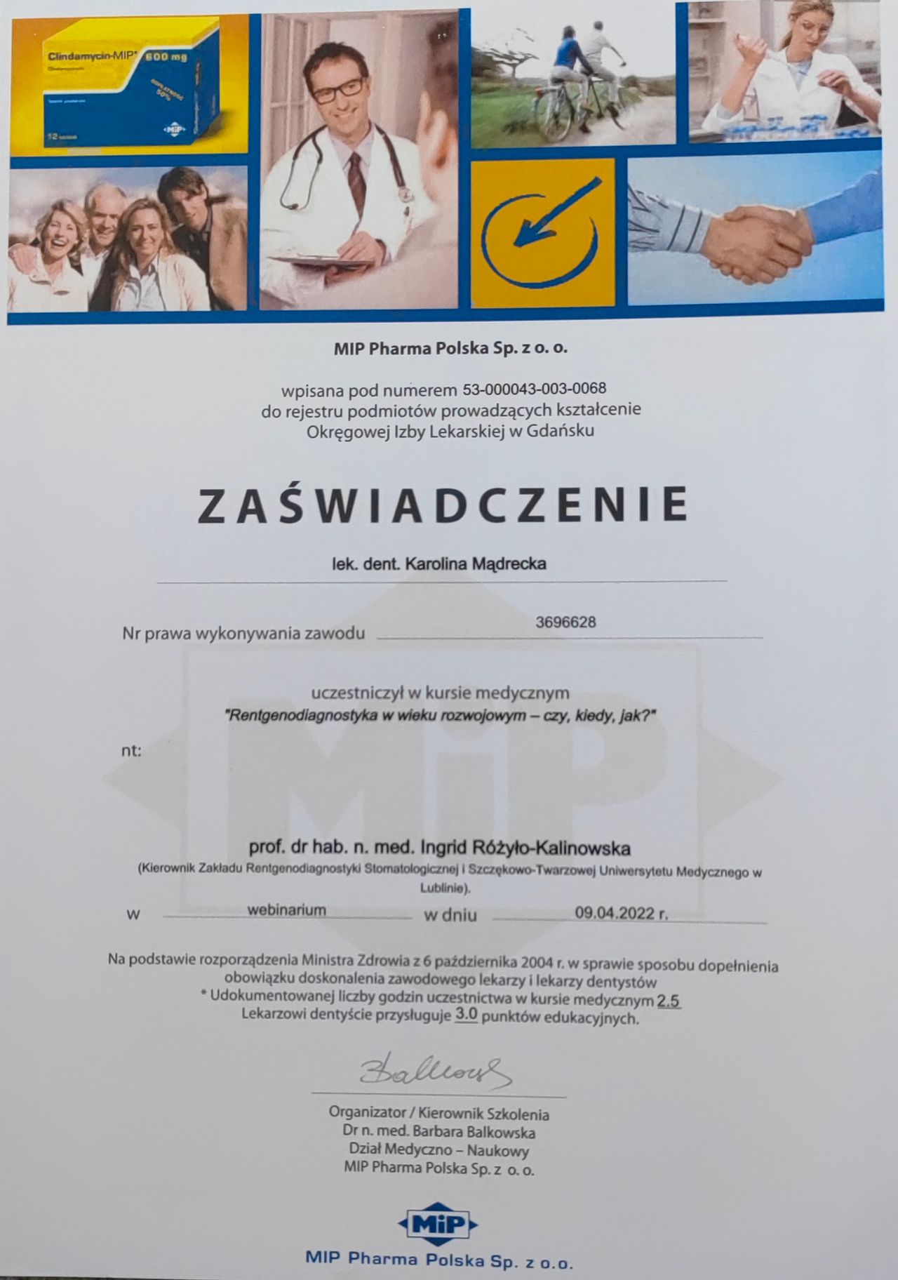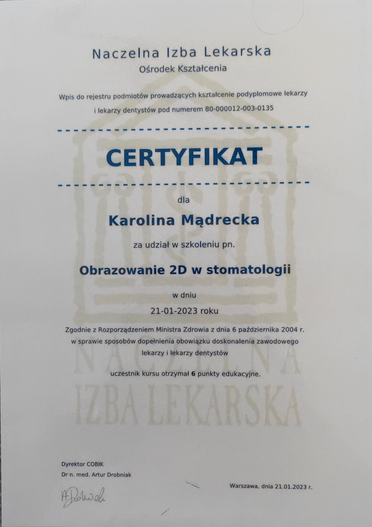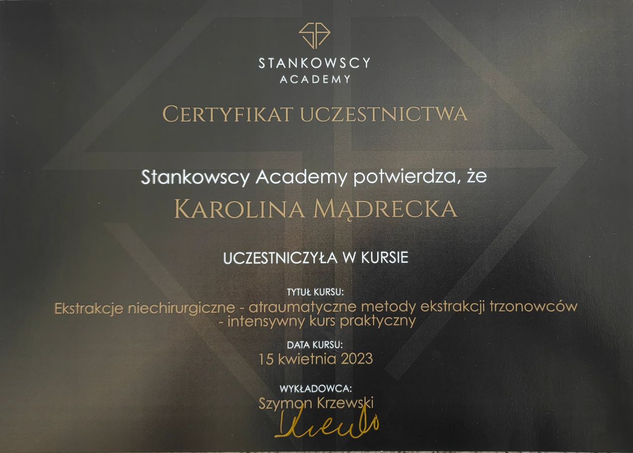 Aby stale podnosić swoje kwalifikacje, uczestniczę w licznych kursach, szkoleniach oraz konferencjach. Moim celem jest nie tylko leczenie schorzeń zębów, ale także poprawa estetyki uśmiechu pacjentów, zapewniając im zdrowe i piękne zęby oraz jak najlepszą pomoc i jakość leczenia.
