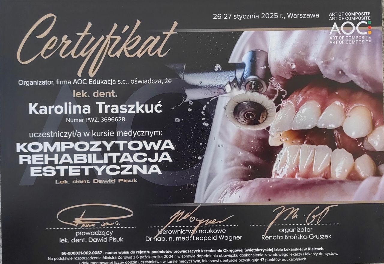 Jesteś już po wizycie u lek. dent. Karolina Traszkuć? Daj znać, co myślisz. Inni pacjenci będą wdzięczni za pomoc w wyborze najlepszego specjalisty.