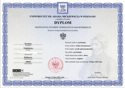 Pracę magisterską obroniłam na Uniwersytecie im. Adama Mickiewicza w Poznaniu. Przez kilka lat współpracowałam z bydgoskim stowarzyszeniem pomocy osobom z zespołem Aspergera w zakresie współprowadzenia Treningów Umiejętności Społecznych. Swój warsztat stale udoskonalam biorąc udział w szkoleniach i kursach. Jako profesjonalna psycholog zdaję sobie sprawę, jak istotne jest dbanie o jakość świadczonej pomocy. Dlatego regularnie uczestniczę także we własnym procesie terapeutycznym, aby utrzymać wysoki standard oferowanych przez mnie usług. Zapewniam przyjazną atmosferę spotkań, która sprzyja otwartości i skupieniu się na rozwiązaniu problemów.