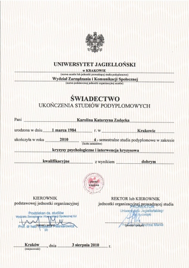*Studia Podyplomowe z kryzysów psychologicznych i interwencji kryzysowej na Wydziale Zarządzania i Komunikacji Społecznej Uniwersytetu Jagiellońskiego,