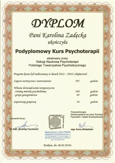 *Podyplomowy Kurs Psychoterapii atestowany przez Sekcję Naukową Psychoterapii Polskiego Towarzystwa Psychiatrycznego,