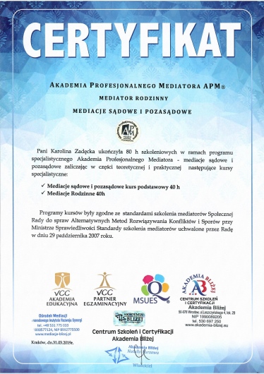 *Certyfikowany Kurs Specjalistyczny Mediatora Rodzinnego,