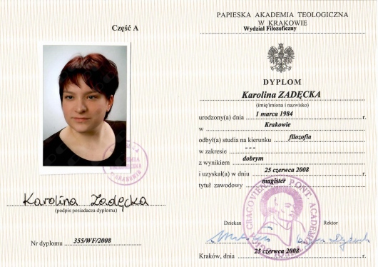 Z wykształcenia jestem filozofem, tytuł magistra uzyskałam na Uniwersytecie Papieskim Jana Pawła II w Krakowie.