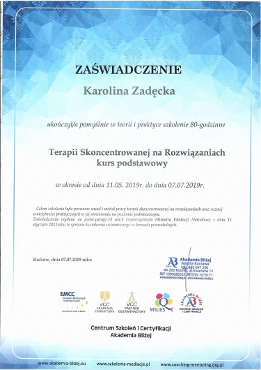 Swoją pracę poddaję regularnej superwizji u certyfikowanych superwizorów. Stale podnoszę swoje kwalifikacje zawodowe, uczestnicząc w szkoleniach i kursach.