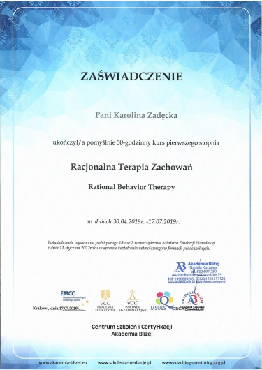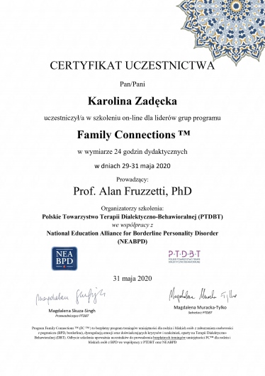 Jestem w trakcie uzyskiwania certyfikatu psychoterapeuty Polskiego Towarzystwa Psychiatrycznego, którego jestem również członkiem.