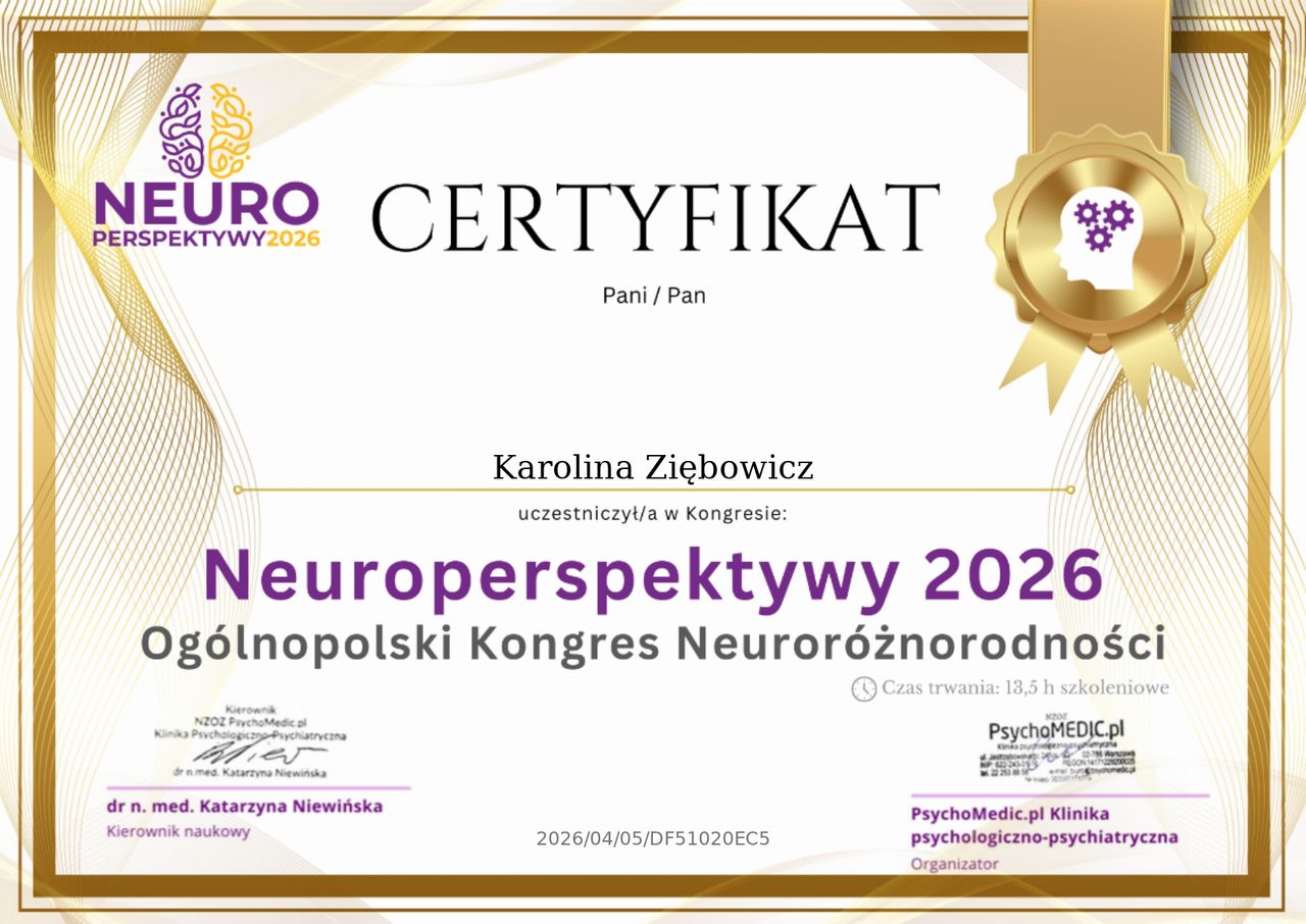 Bardzo polecam diagnozę u Pani Karoliny. Robiłam diagnozę AuDHD i czułam się bardzo zaopiekowana. Same spotkania były dla mnie również terapeutyczne, pierwszy raz w życiu odważyłam opowiedzieć komuś o moich emocjach, o tym co czuję i czułam przez całe życie. W końcu poczułam, że ktoś rozumie o co chodzi. Do tego dostałam kilka fajnych wskazówek, które pomagają w życiu codziennym.