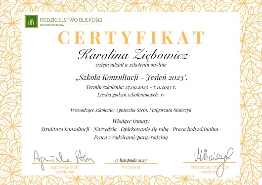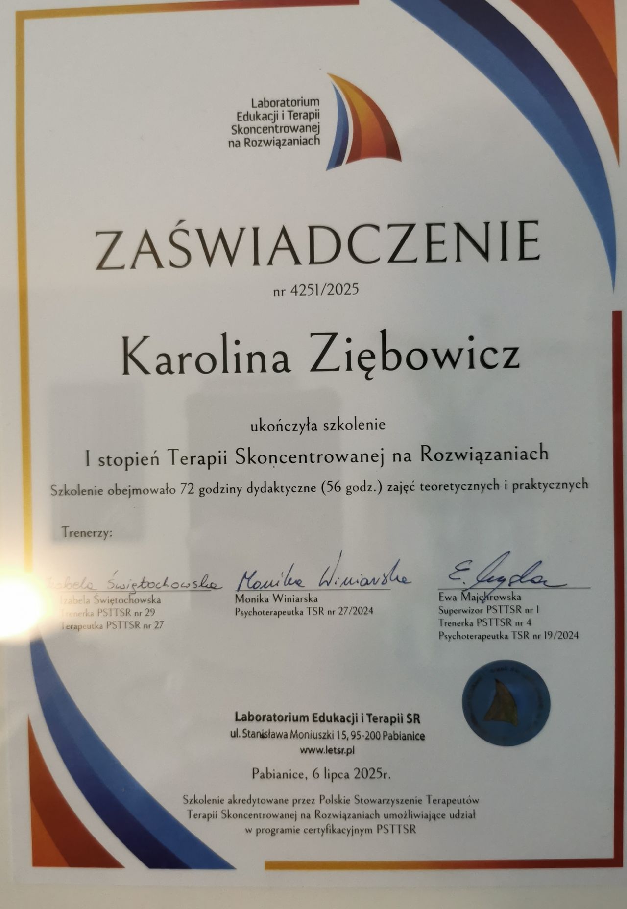 Czy Karolina Ziębowicz przyjmuje online, bez konieczności pojawiania się w placówce?Tak, Karolina Ziębowicz oferuje konsultacje online. Wybierz opcję „konsultacja online” przy umawianiu wizyty, a zobaczysz dostępne terminy.