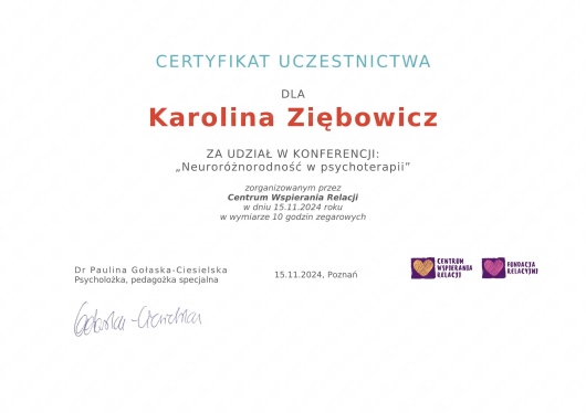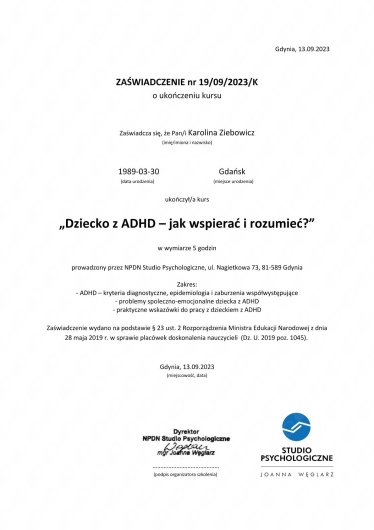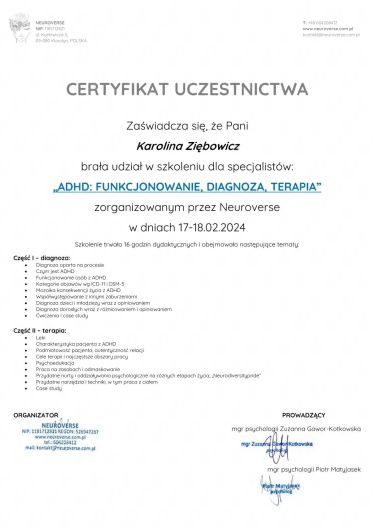 Do pani Karoliny zgłosiłam się w celu wykonania diagnozy w kierunku ADHD. Jestem bardzo zadowolona z tego, jak przebiegł ten proces. Wizyty (łącznie 5 - jedna zapoznawcza, dwie wizyty pod kątem ADHD i dwie pod kątem spektrum autyzmu) przebiegły w miłej i profesjonalnej atmosferze, pani Karolina była do nich przygotowana, pamiętała fakty z poprzednich wizyt. Czułam się swobodnie i co najważniejsze czułam się dobrze zrozumiana. Wizyty były punktualne, gabinet bardzo przyjazny. Dostałam też polecenia literatury i innych źródeł do własnej psychoedukacji co bardzo doceniam. Opinia, którą dostałam po całym procesie jest wnikliwa i szczegółowa. Serdecznie polecam proces diagnozy u pani Karoliny.