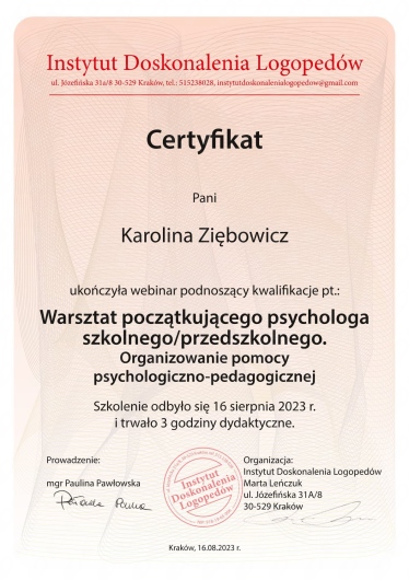Jaki jest zakres porad oferowanych przez Karolina Ziębowicz?Karolina Ziębowicz to psycholog. Na podstawie swojego doświadczenia i wykształcenia Karolina Ziębowicz oferuje usługi takie jak: Konsultacja psychologiczna, psychoedukacja, diagnoza ADHD dla dorosłych, Diagnoza autyzmu, Konsultacja psychologiczna online.