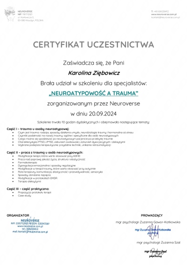Nazywam się Karolina Ziębowicz i jestem psychologiem. Obszar, którym się zajmuję to diagnoza psychologiczna i wsparcie osób w spektrum autyzmu i/lub z ADHD. Pracuję z osobami od 16 roku życia. Mogę powiedzieć, że nie tylko rozumiem, ale i wiem z czym mogą zmagać się osoby neuroatypowe w neurotypowym świecie.