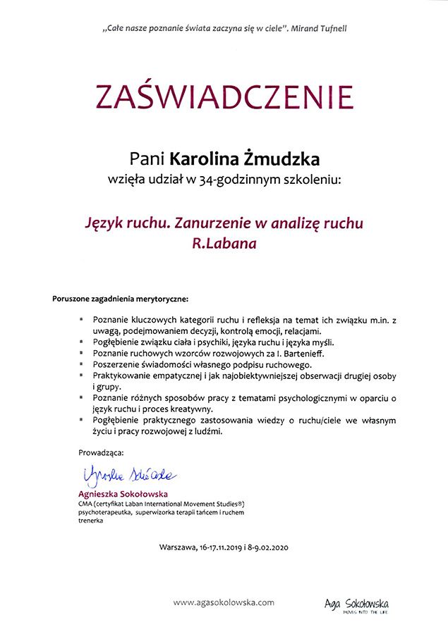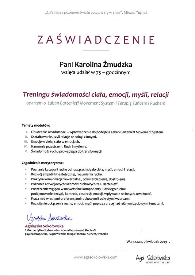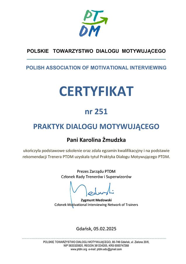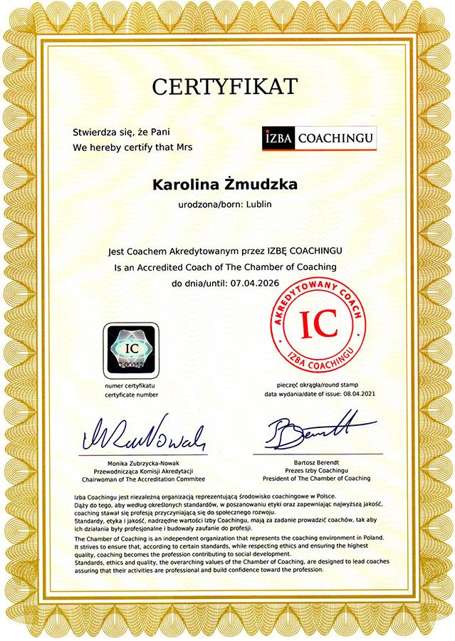 Zdecydowałam się na coaching, bo oszałamiało mnie otaczajace środowisko, a ja nie potrafiłam sobie z nim poradzić. Dzięki pracy z Panią Karoliną Żmudzką obiektywnie spojrzałam na swoją osobę. Nasze sesje pozwoliły mi realnie zobaczyć mój świat, ustalić mądre założenia. Usystematyzować swoje plany, działania jakie chciałam podjąć, wyłonić obszary z których zbudowane jest moje życie jak praca, studia, czas dla siebie... Nabrałam szacunku do siebie i wprowadziłam dystans w stosunku do ludzi którzy próbuja wejść na głowę. Pani Karolina jest mądrym i konkretnym nauczycielem. Pomogła mi złapać równowagę oraz pokazałą narzędzia aby w odpowiedniej sytuacji z nich korzystać.