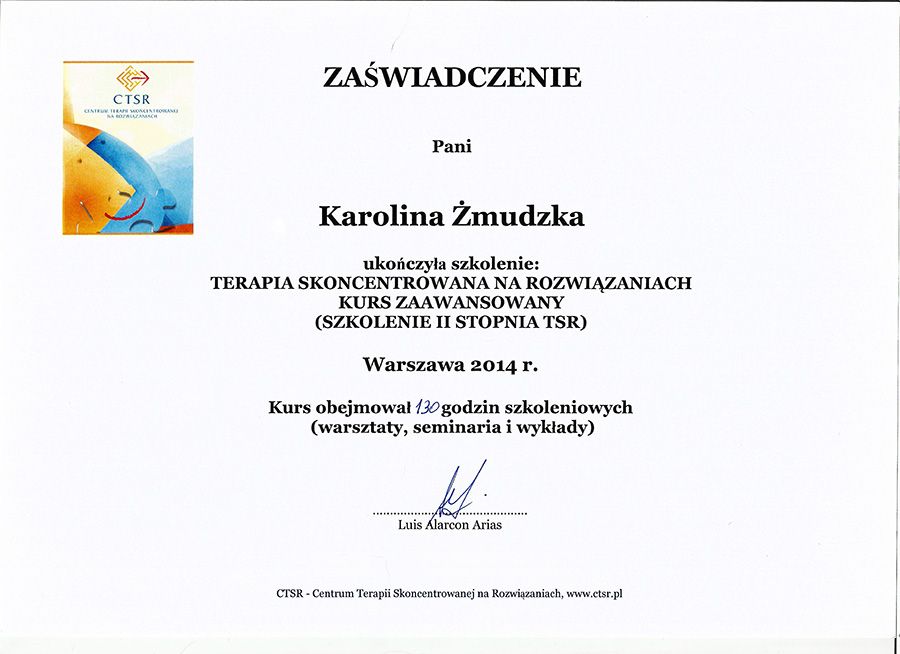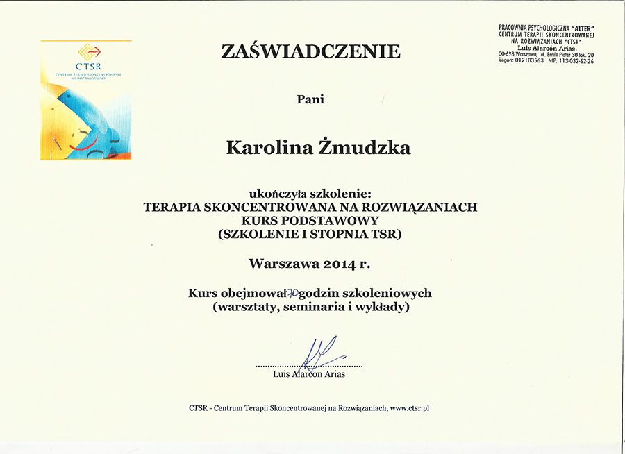 TERAPIA PSYCHOLOGICZNA, 50 min: Terapia krótkoterminowa w podejściu Solution Focused Brief Therapy (Terapia Skoncentrowana na Rozwiązaniach) składa się od kilku do kilkunastu spotkań odbywających się raz w tygodniu. Jest nastawiona na przyszłość, wdrażanie zmian, poszukiwanie najbardziej optymalnych rozwiązań, wzmocnienie zasobów i mocnych stron Klienta.