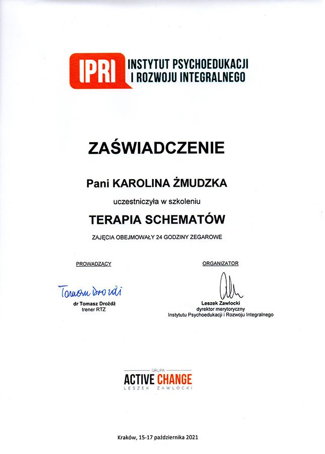 Jestem psychologiem, terapeutą Terapii skoncentrowanej na rozwiązaniach (SFBT), mediatorem, praktykiem Dialogu motywującego, socjoterapeutą, trenerem umiejętności psychospołecznych, diagnostą, doradcą zawodowym oraz akredytowanym coachem i superwizorem IC. Mam 17-letnie doświadczenie w pracy indywidualnej i grupowej z dorosłymi, młodzieżą, dziećmi i rodzicami.