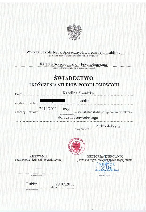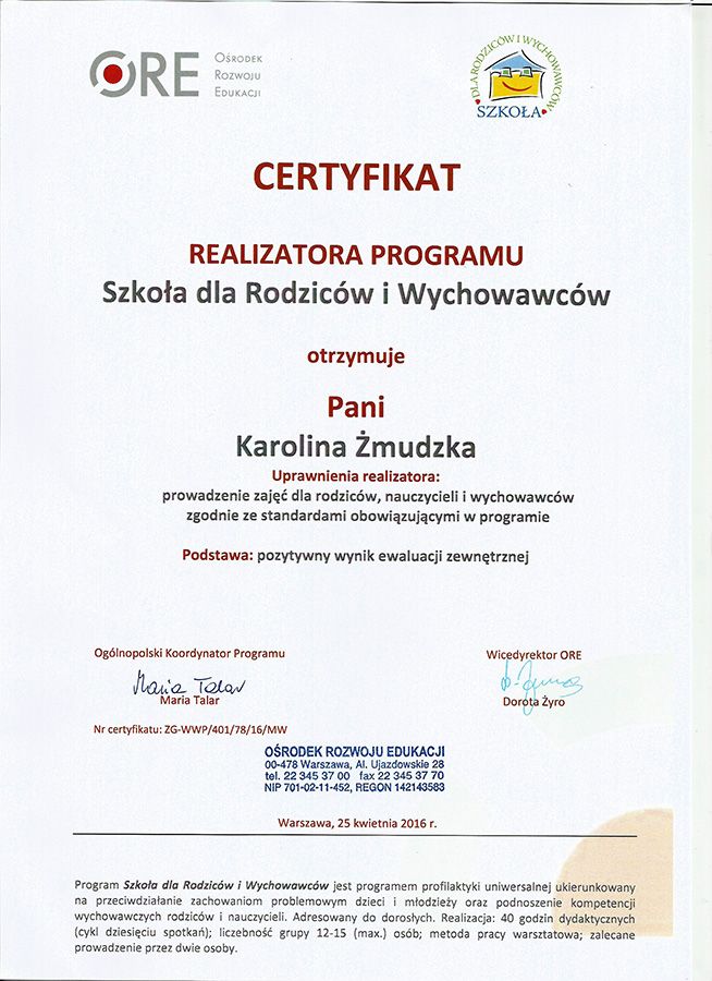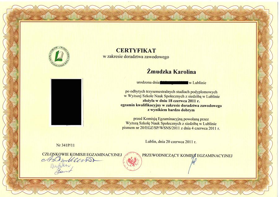Pani Karolina jest profesjonalistą bardzo dużego formatu. Co ważne od samego początku wprowadza miłą, przyjazną i spokojną atmosferę. Na każde spotkanie jest przygotowana, zorganizowana i uważnie słucha. Oczywiście efekt pracy w dużej mierze zależy od nas samych – jak głęboko uda nam się wejść w samych siebie. Dla mnie nie był to łatwy cykl spotkań, ale dzięki p. Karolinie udało mi się odnaleźć samą siebie i ustalić na jakie tory mam pokierować swoje życie zawodowe. Absolutnie nie żałuję czasu, spotkań i funduszy przeznaczonych na sesje z p. Żmudzką – to najlepszy prezent jaki możemy podarować sobie lub naszym bliskim!