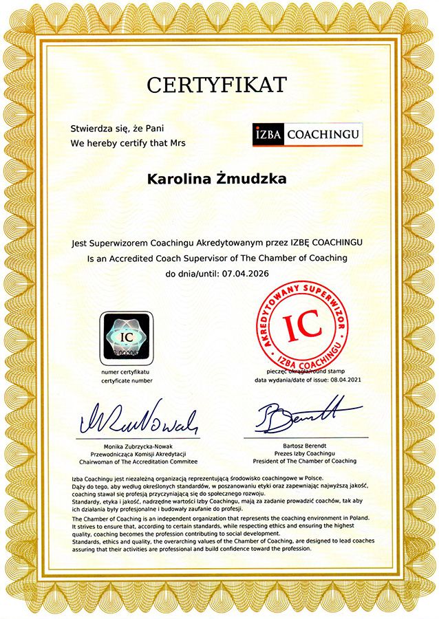 Prowadzę coaching - jestem akredytowanym coachem i superwizorem Izby Coachingu z 12 letnim doświadczeniem (ponad 4000h pracy z klientami). Pracuję z ludźmi, którzy stoją u progu ważnych decyzji i zmian, poszukują swojej drogi, chcą odkryć siebie i poczuć w życiu spełnienie. Specjalizuję się w coachingu kariery i pracy z osobami wypalonymi zawodowo, prowadzę także coaching menadżerski, executive coaching i mentoring dla najwyższej kadry zarządzającej. Od 2014 roku jako członek Izby Coachingu aktywnie angażuję się w promowanie profesjonalnego coachingu w Polsce. Jestem wykładowcą na studiach podyplomowych "Coaching i mentoring" i "Menadżer XXI w." na Uniwersytecie Marii Curie Skłodowskiej.DLA FIRM